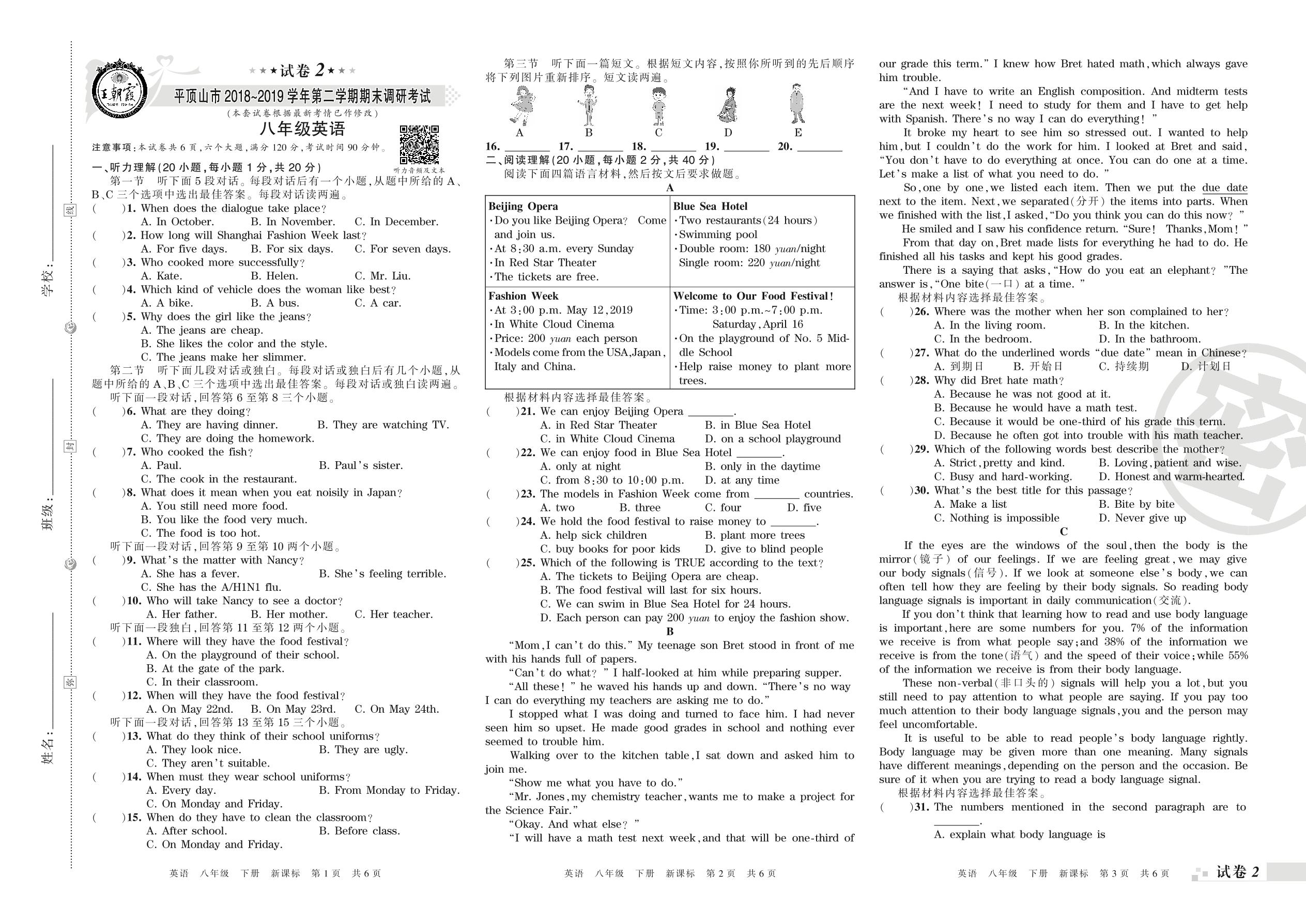 2018-2019学年第二学期平顶山市八年级英语试卷(新课版)【2】