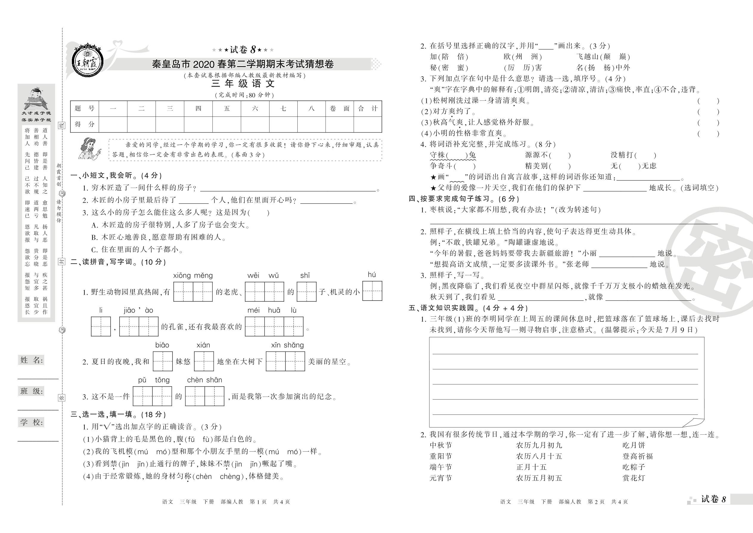 2018-2019学年第二学期秦皇岛市猜想卷三年级语文试卷(人教版)【8】