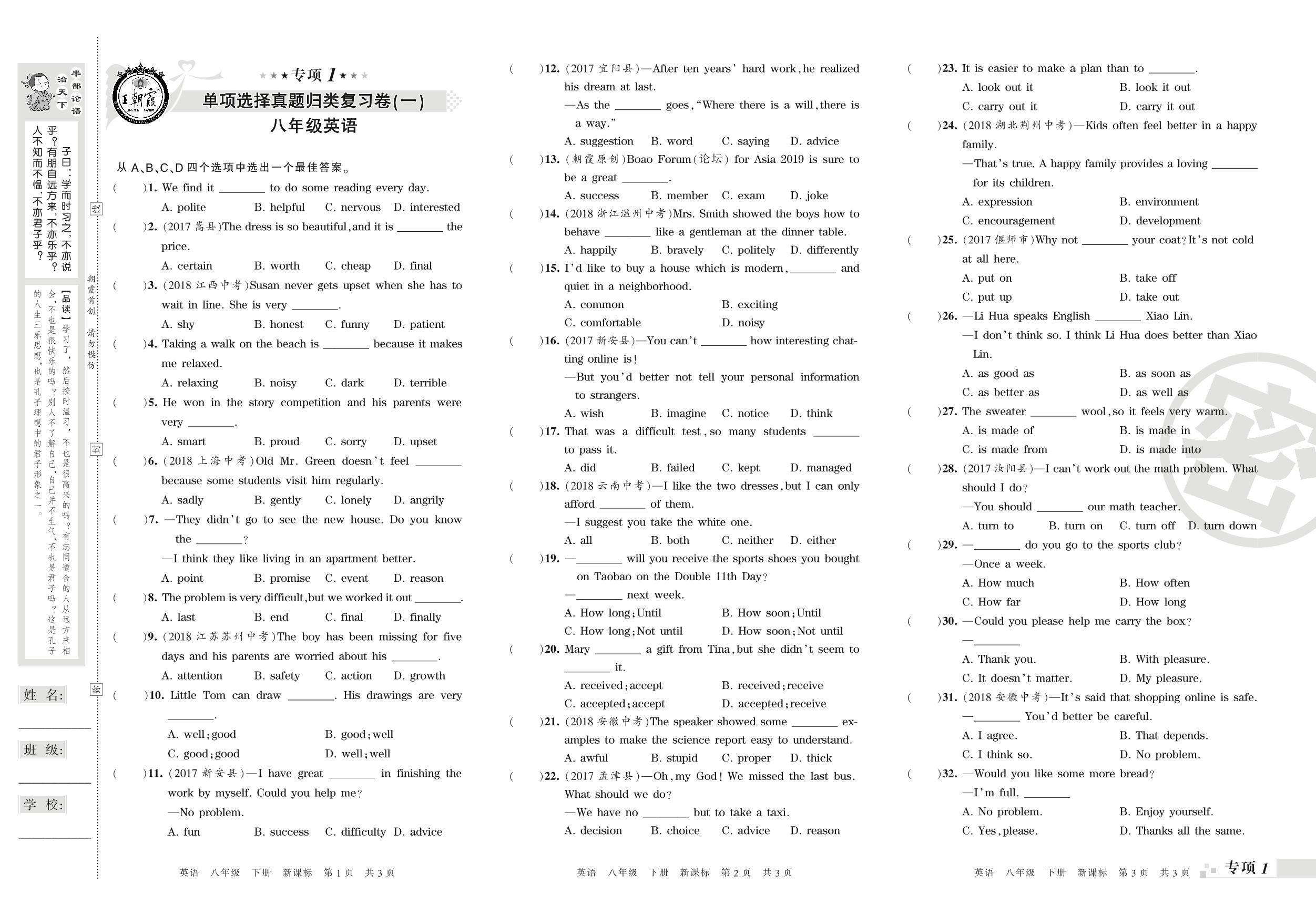 王朝霞期末专项卷——单项选择(一)(二)真题归类复习卷八年级下册英语(新课版)_R210809103742【0】