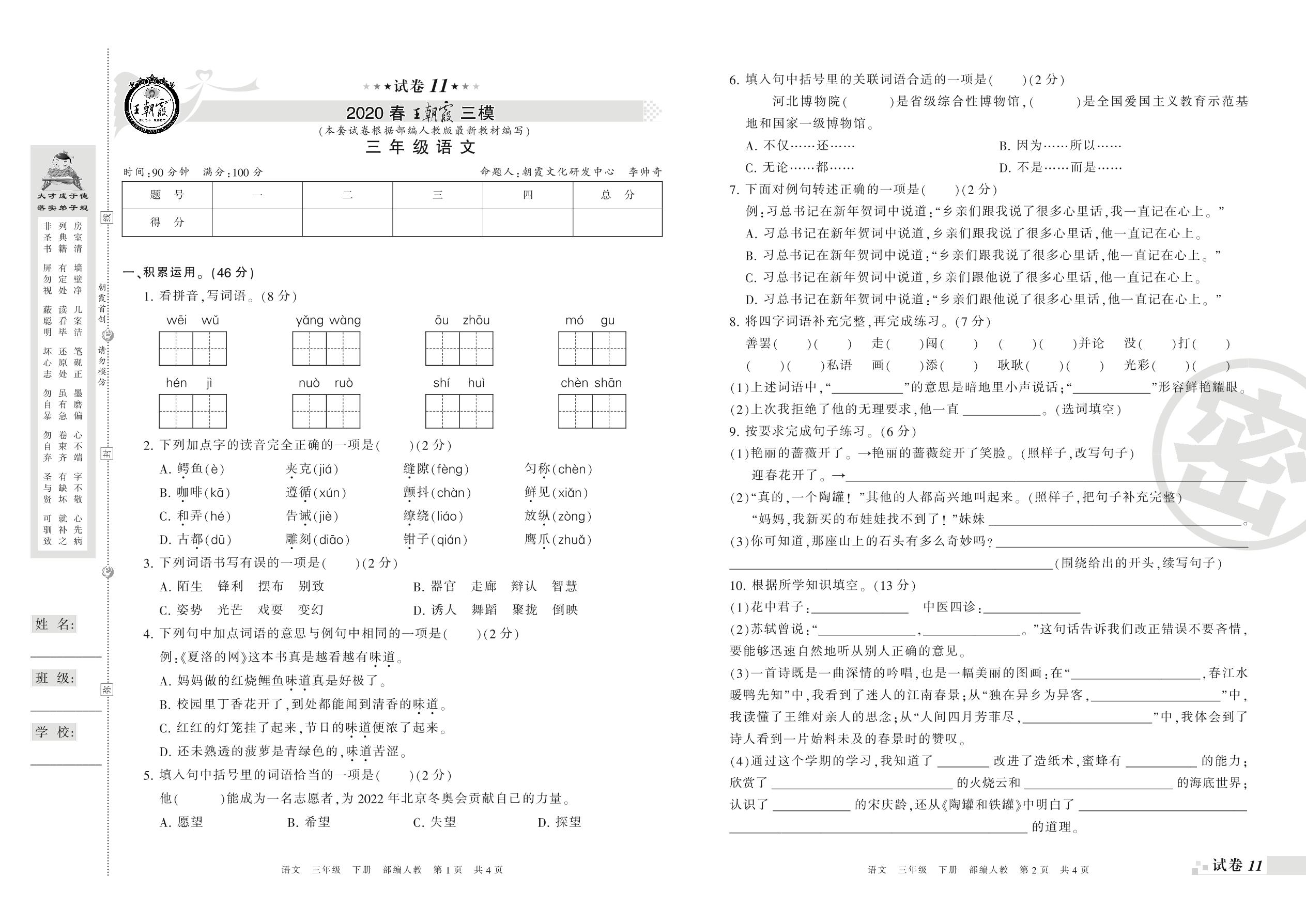 王朝霞期末模拟卷三年级下册语文(人教版)_R21080191247【11】