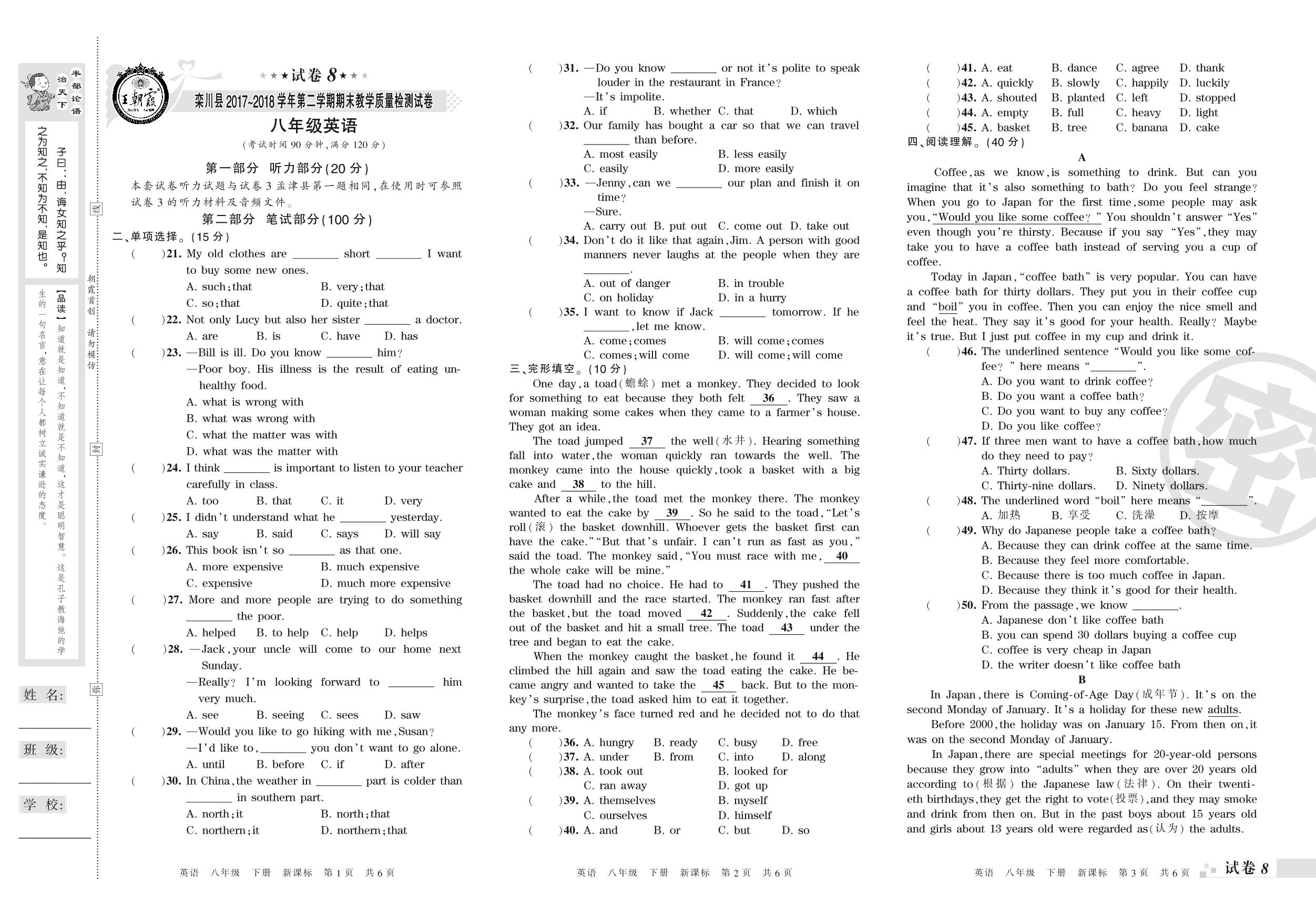 2017-2018学年第二学期洛阳市栾川县八年级英语试卷(新课版)【8】