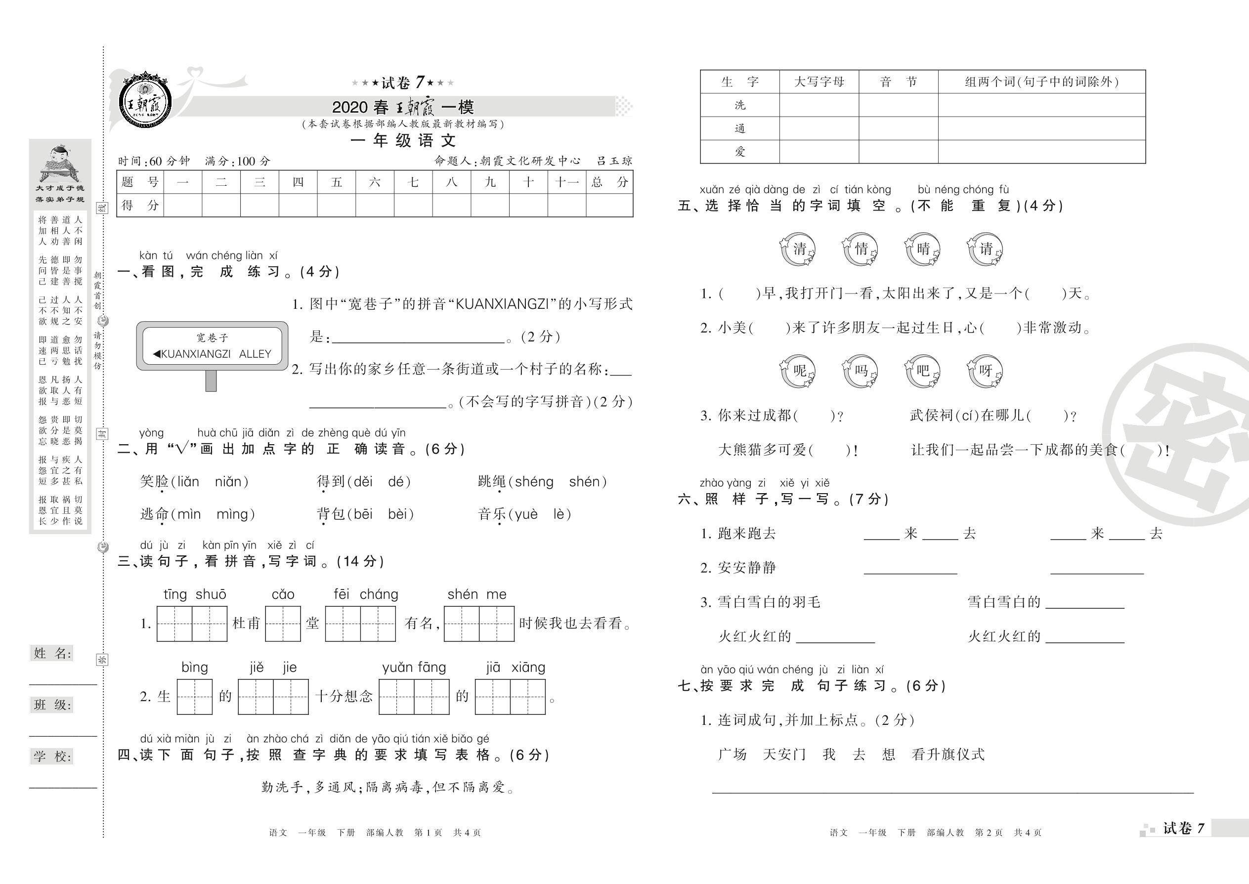 王朝霞期末模拟卷一年级下册语文(人教版)_R210731175619【7】