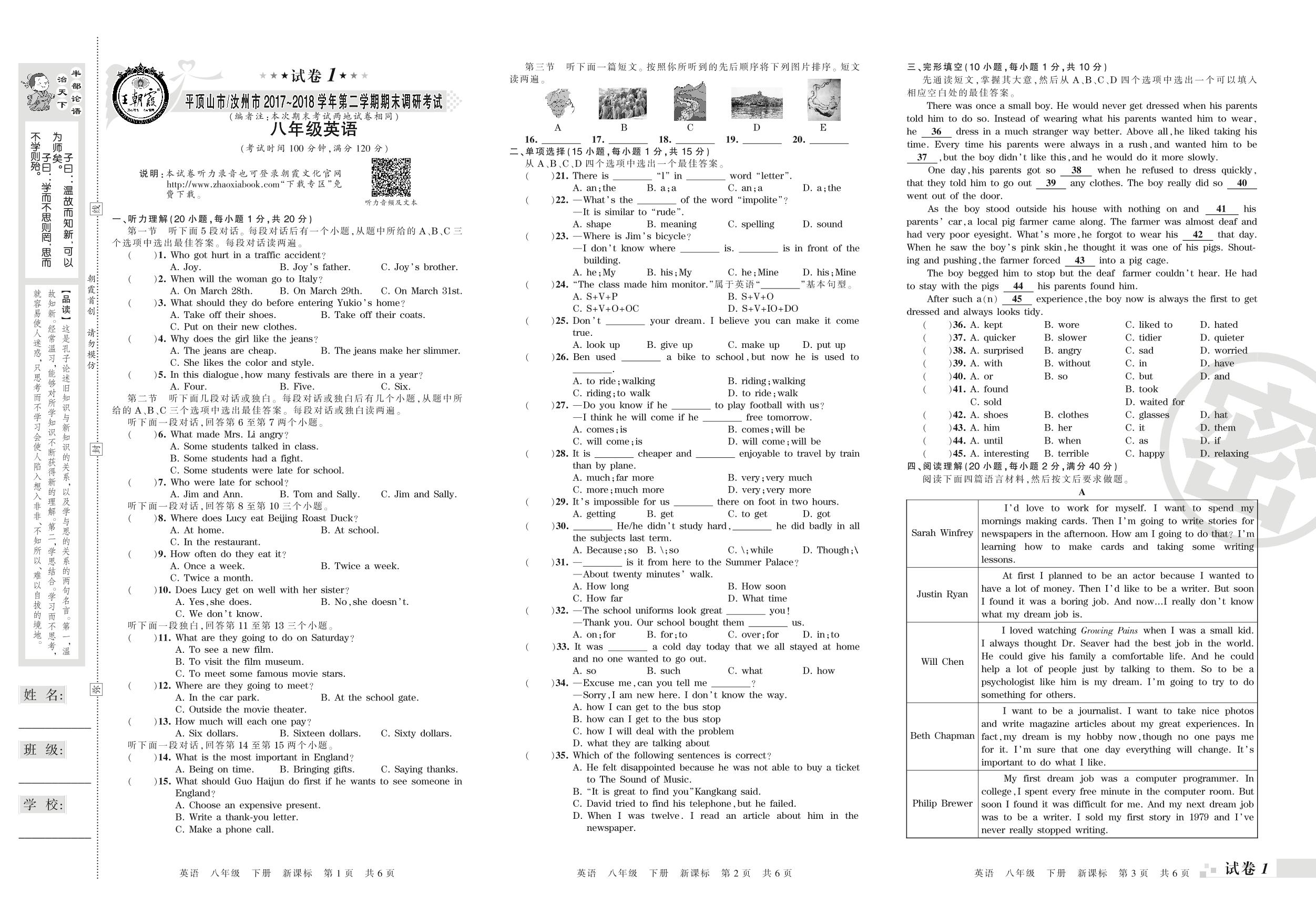 2017-2018学年第二学期平顶山市、汝州市八年级英语试卷(新课版)【1】