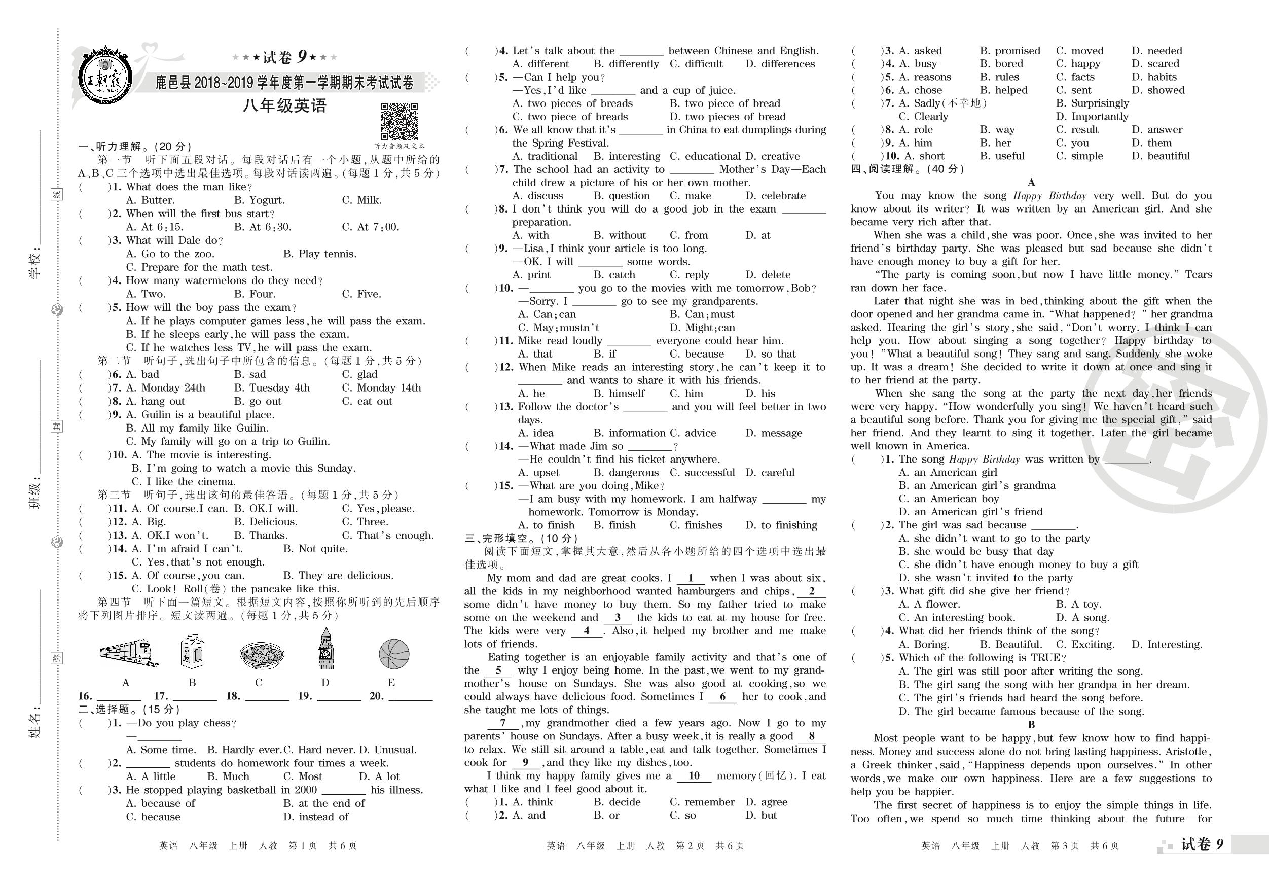 2018-2019学年第一学期周口市鹿邑县八年级英语试卷(人教版)【9】