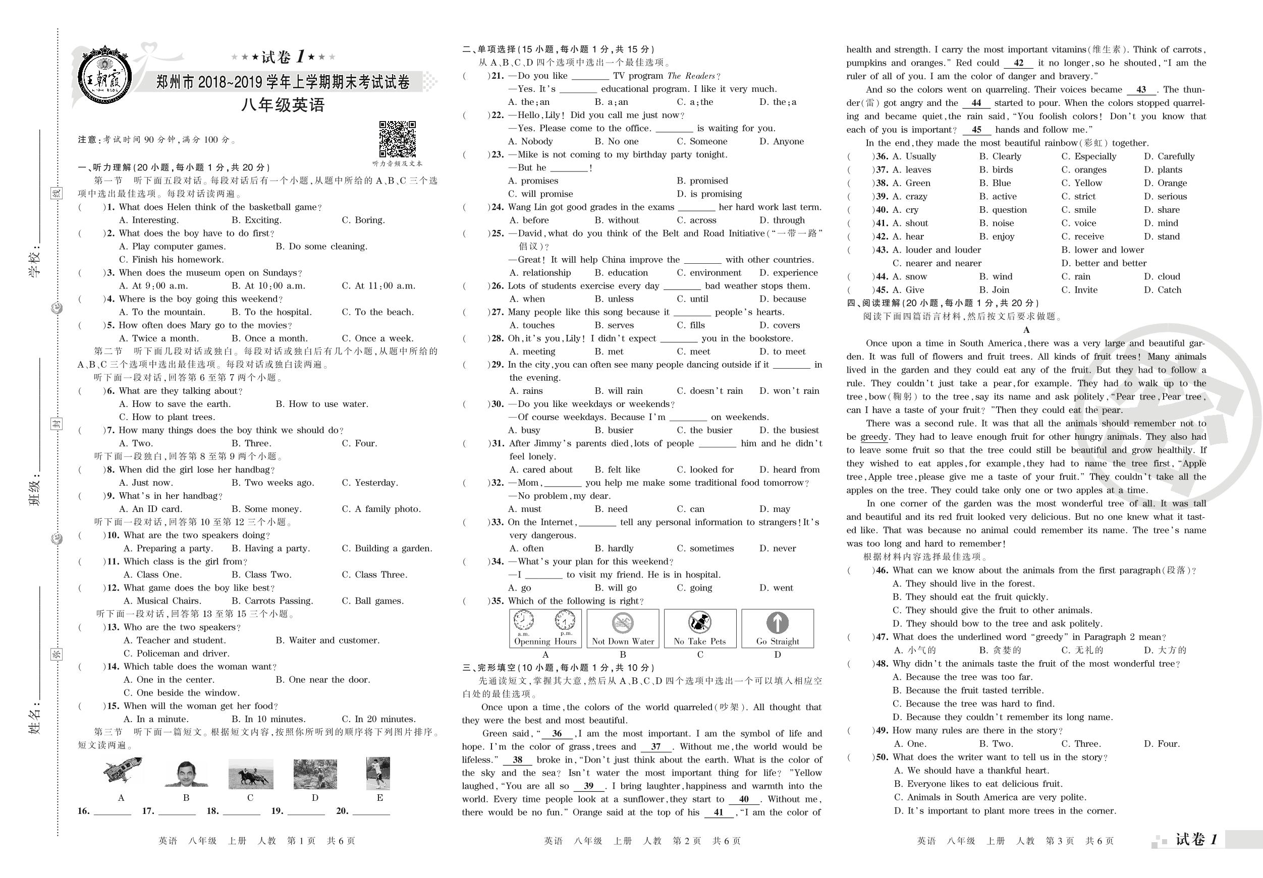 2018-2019学年第一学期郑州市八年级英语试卷(人教版)_R210809104511【1】