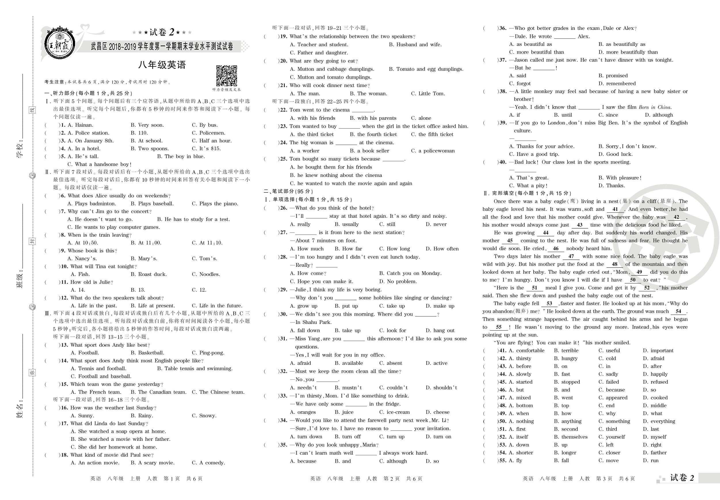 2018-2019学年第一学期武汉市武昌区八年级英语试卷(人教版)【2】