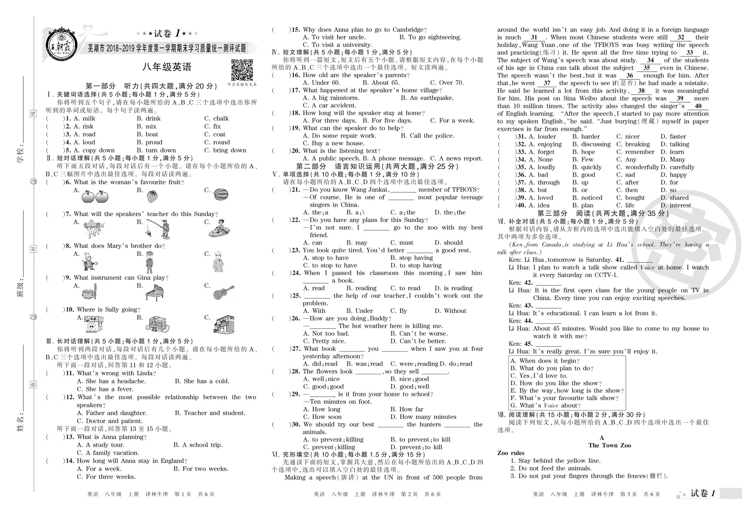 2018-2019学年第一学期芜湖市八年级英语试卷(译林版)【1】