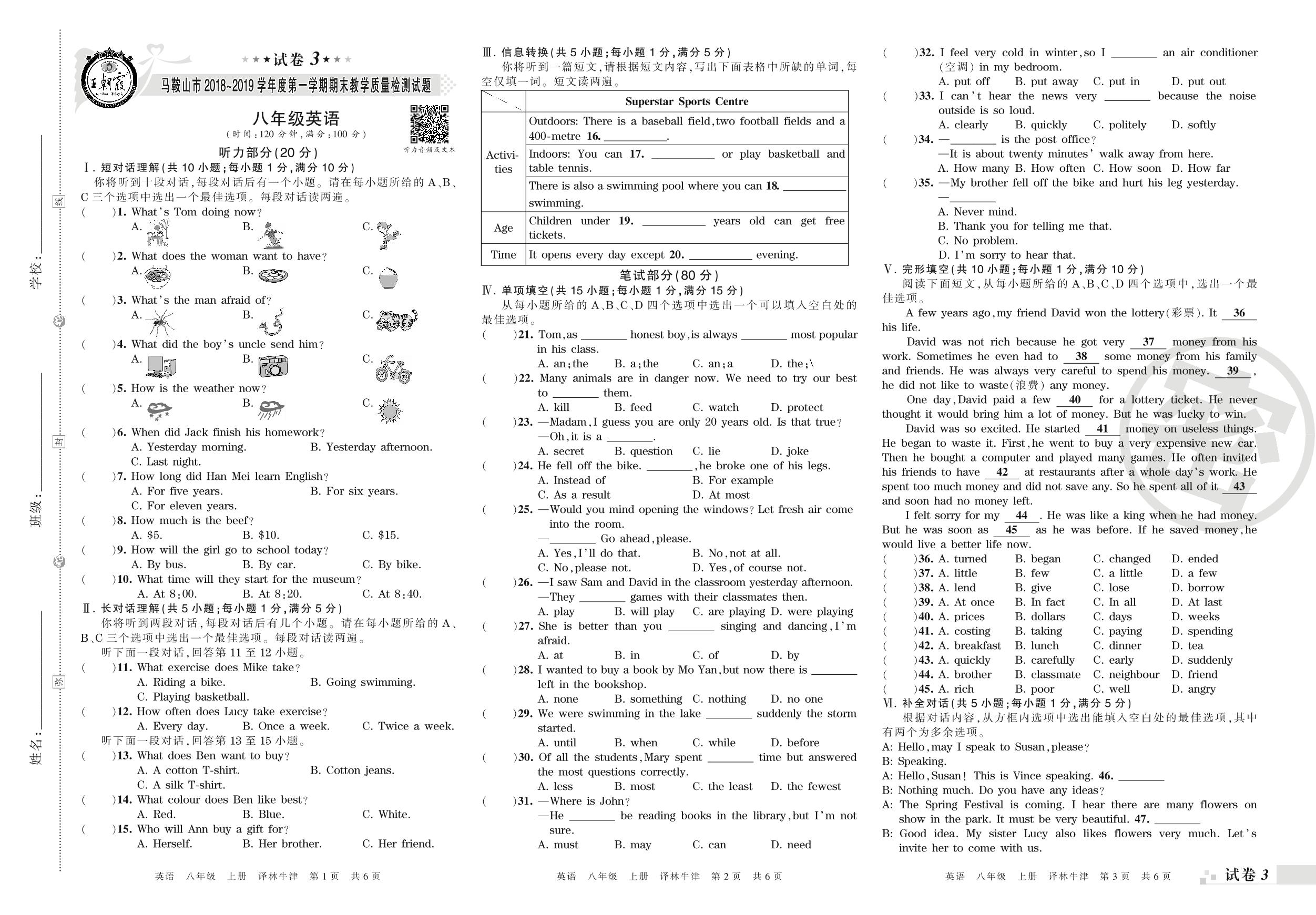 2018-2019学年第一学期马鞍山市八年级英语试卷(译林版)【3】