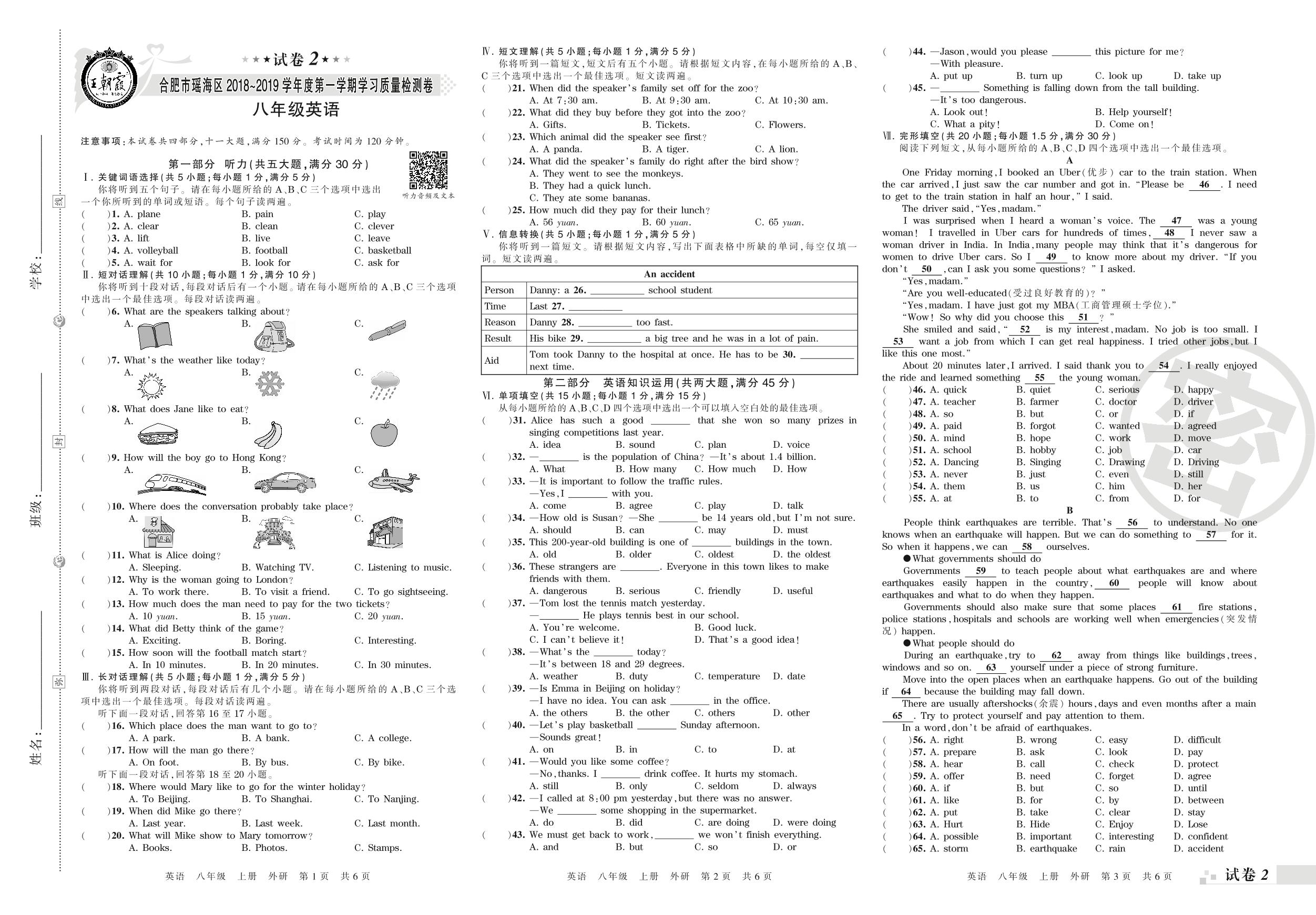 2018-2019学年第一学期合肥市瑶海区八年级英语试卷(外研版)【2】