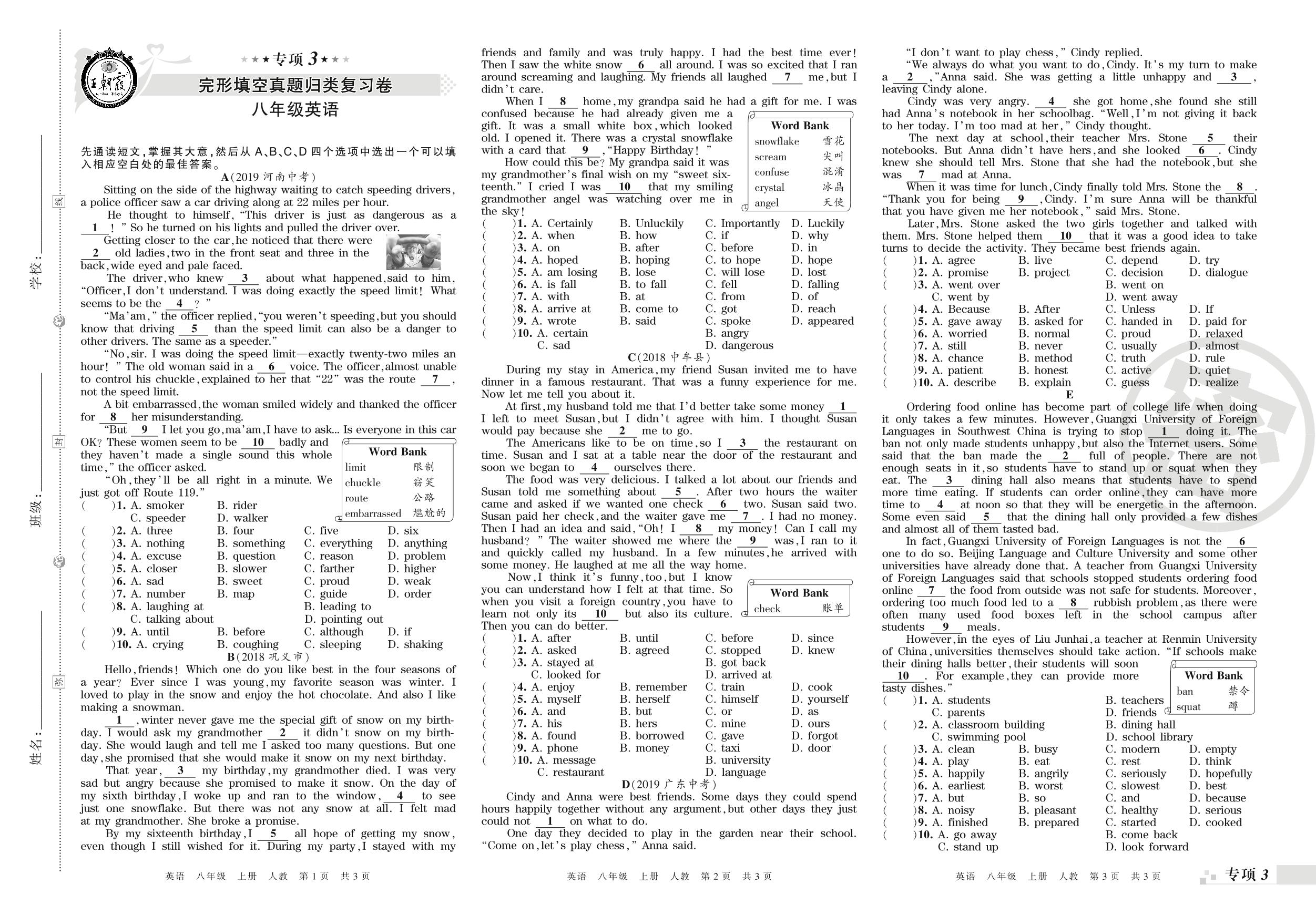 王朝霞期末专项卷——完形填空、选择型阅读真题归类复习八年级上册英语(人教版)_R210809105026【0】