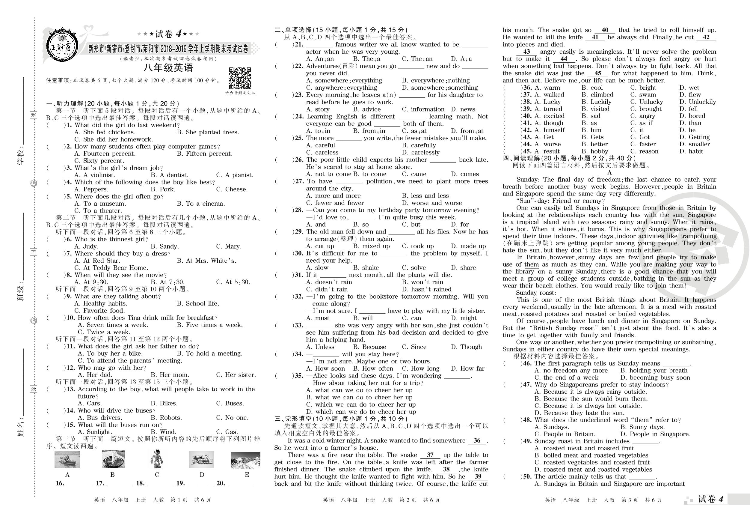 2018-2019学年第一学期新郑市、新密市、登封市、荥阳市八年级英语试卷(人教版)【4】