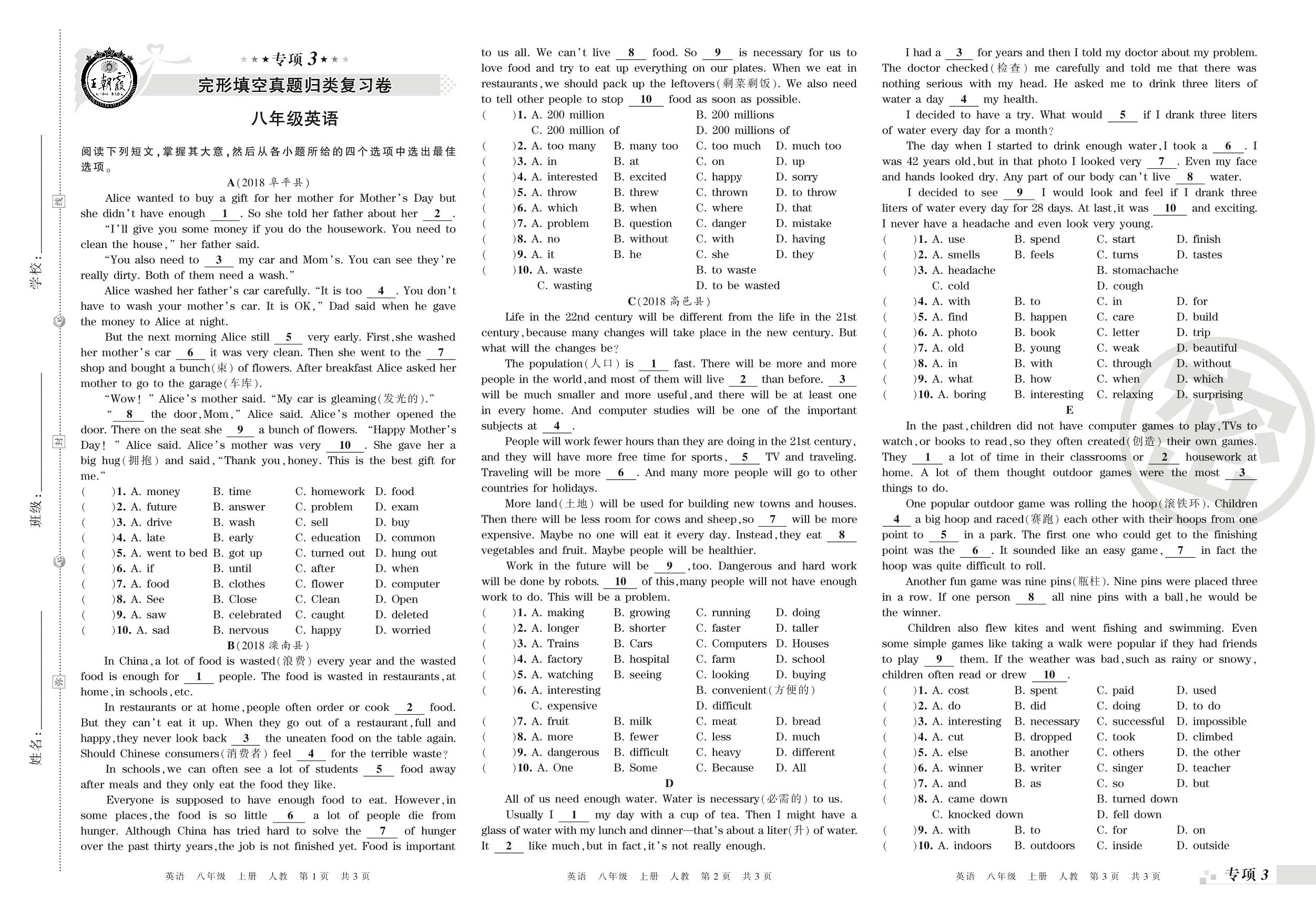 王朝霞期末专项卷——完形填空、阅读理解真题归类复习八年级上册英语(人教版)_R210809105224【0】