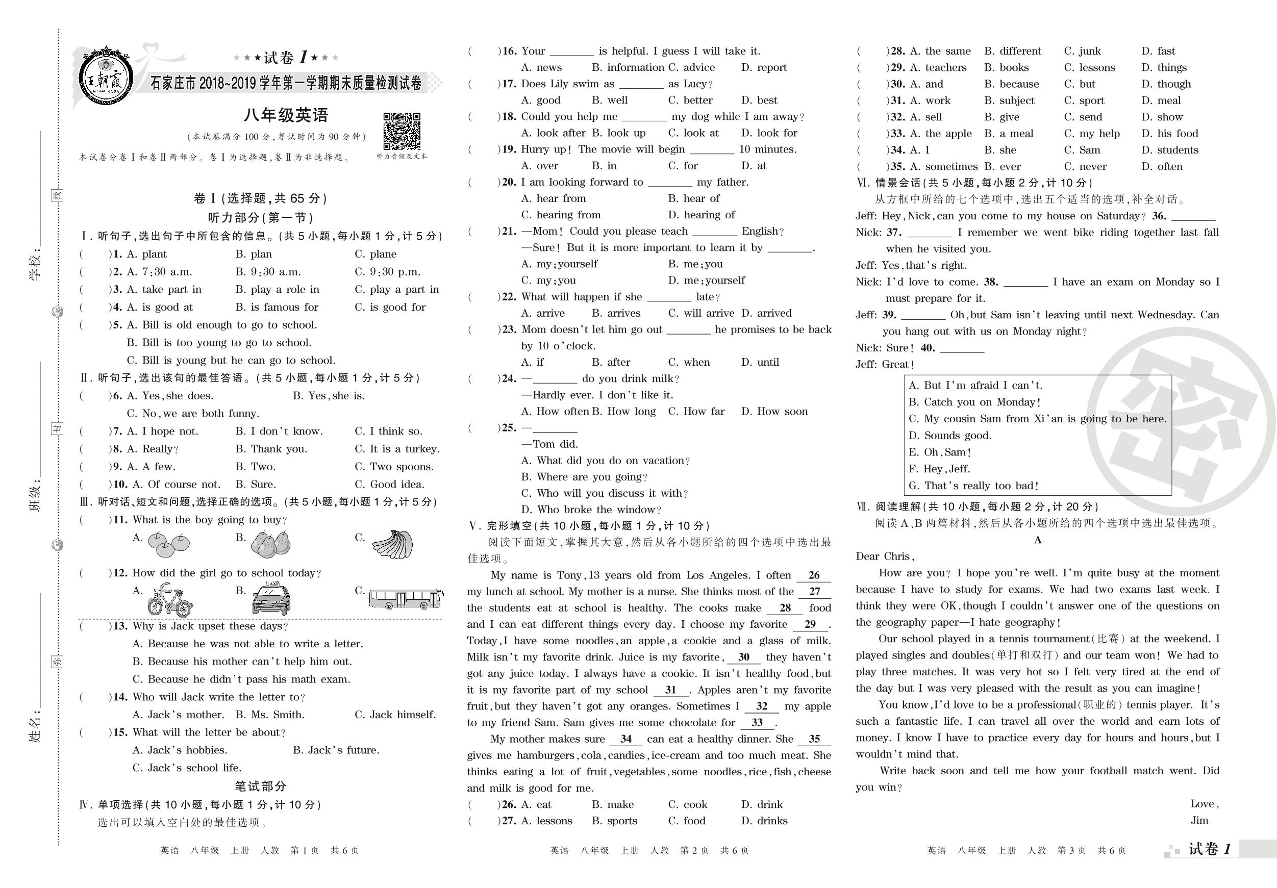 2018-2019学年第一学期石家庄市八年级英语试卷(人教版)【1】