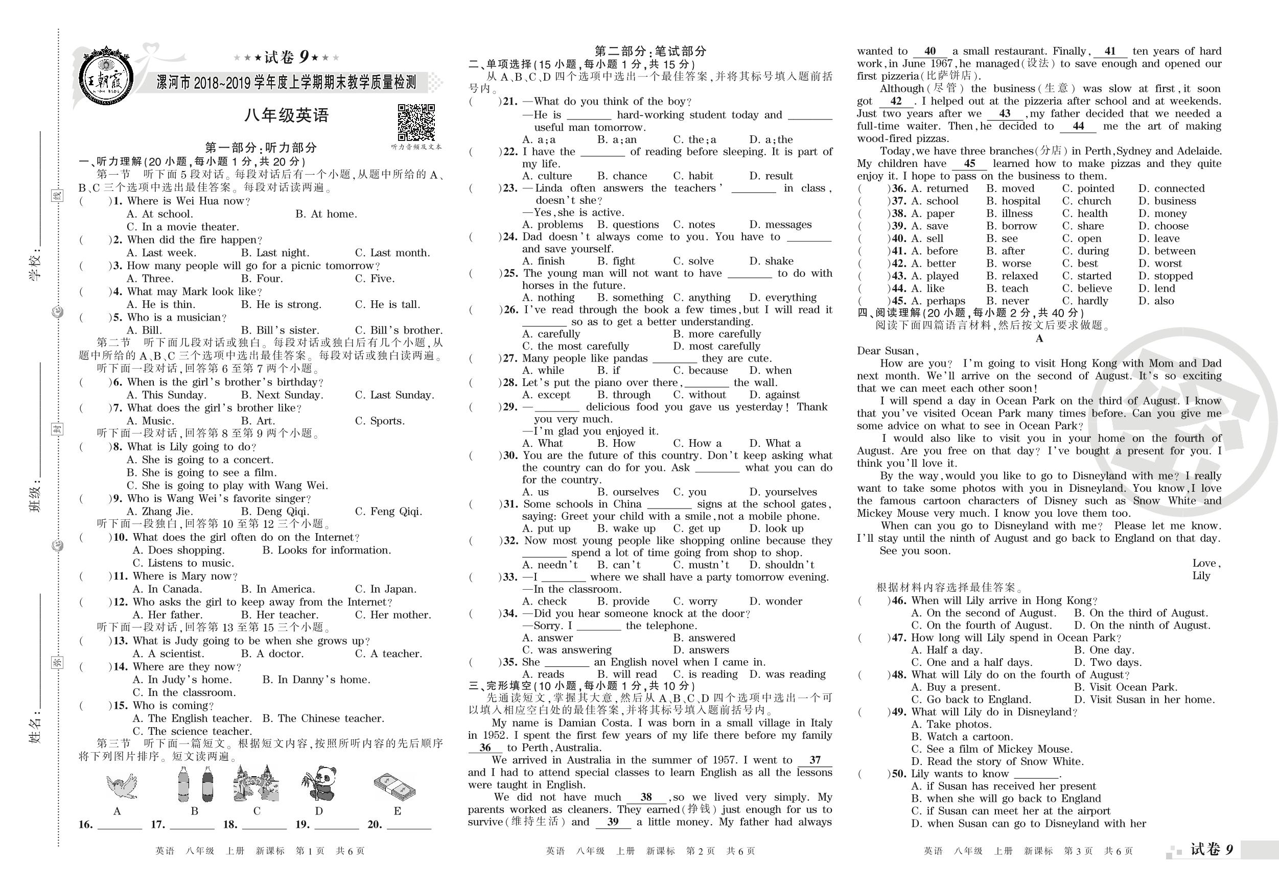 2018-2019学年第一学期漯河市八年级英语试卷(新课版)【9】