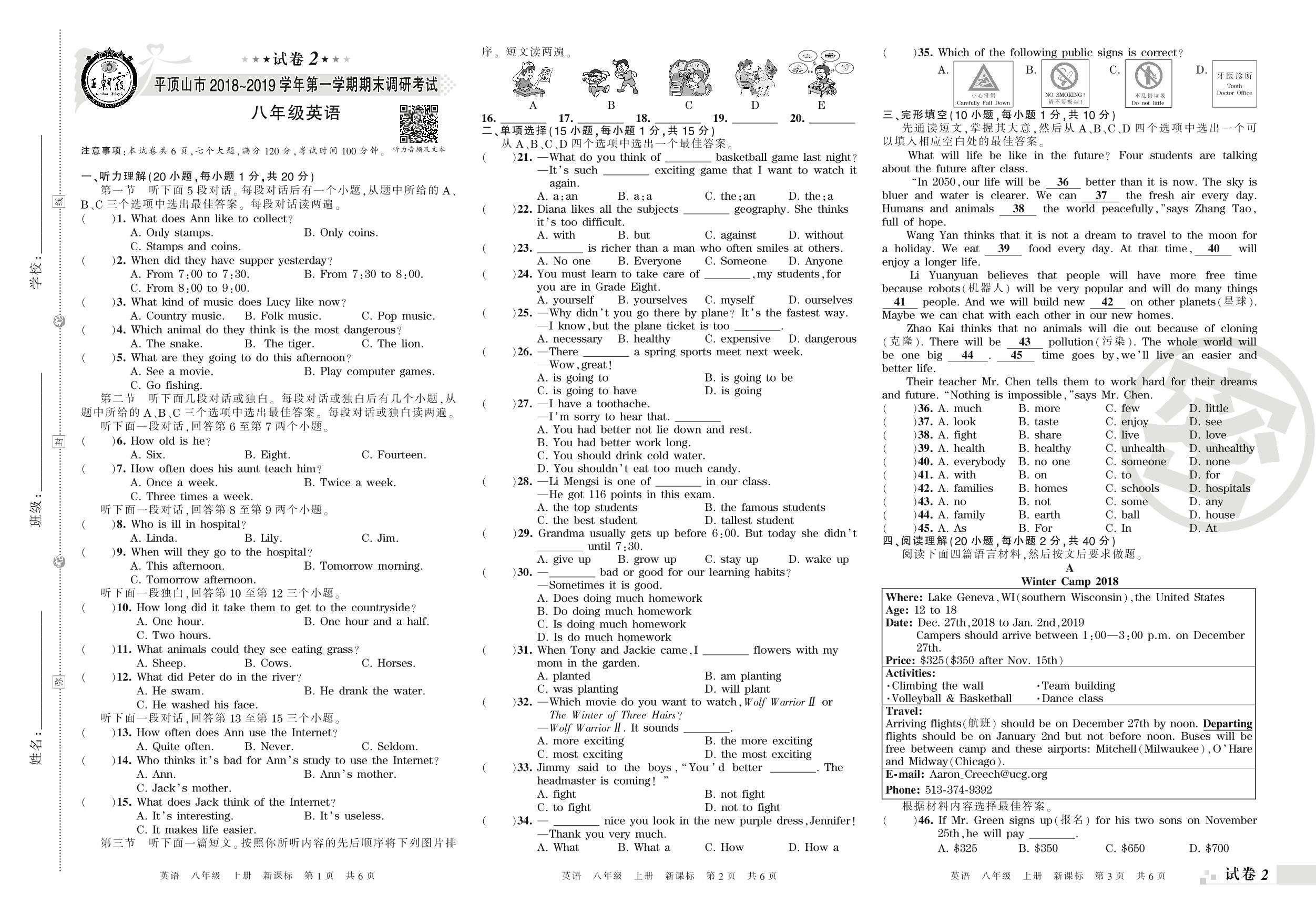 2018-2019学年第一学期平顶山市八年级英语试卷(新课版)【2】