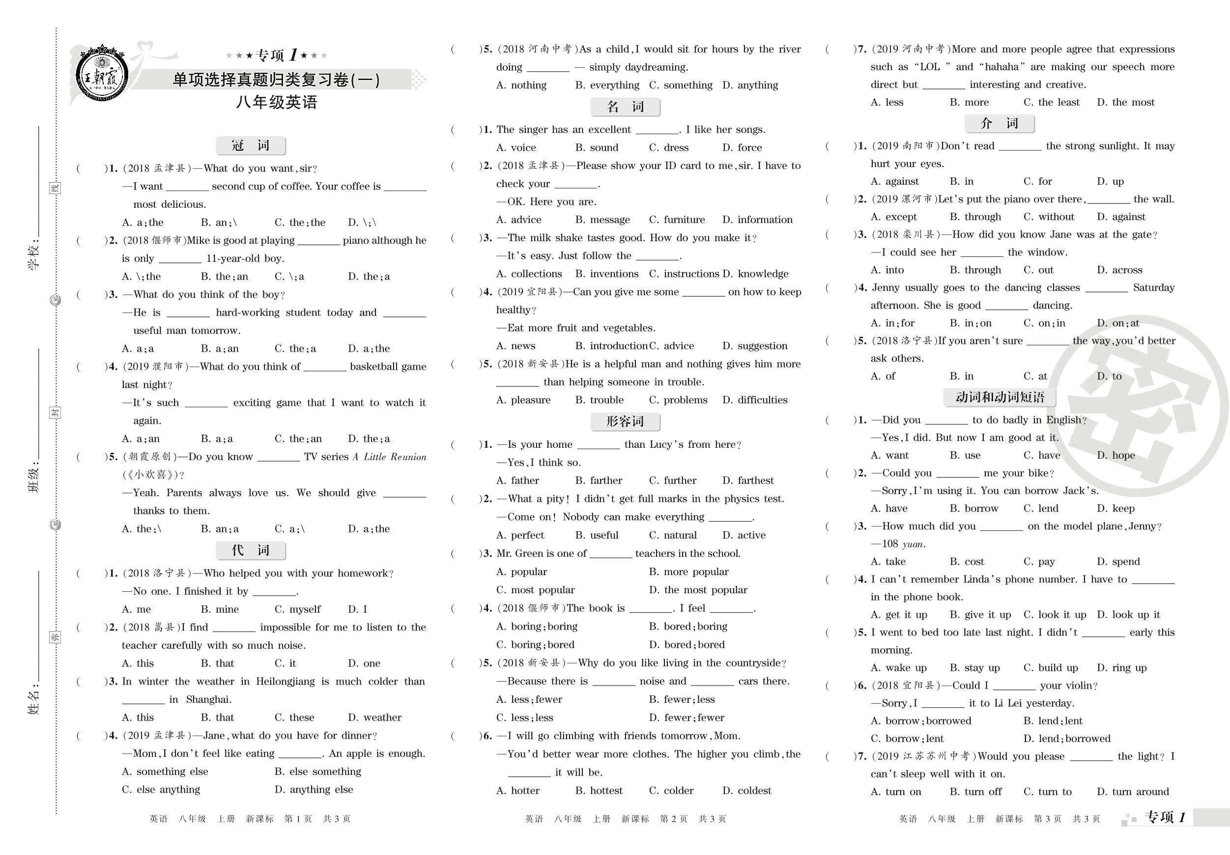 八年级英语新课标版上册专项卷
