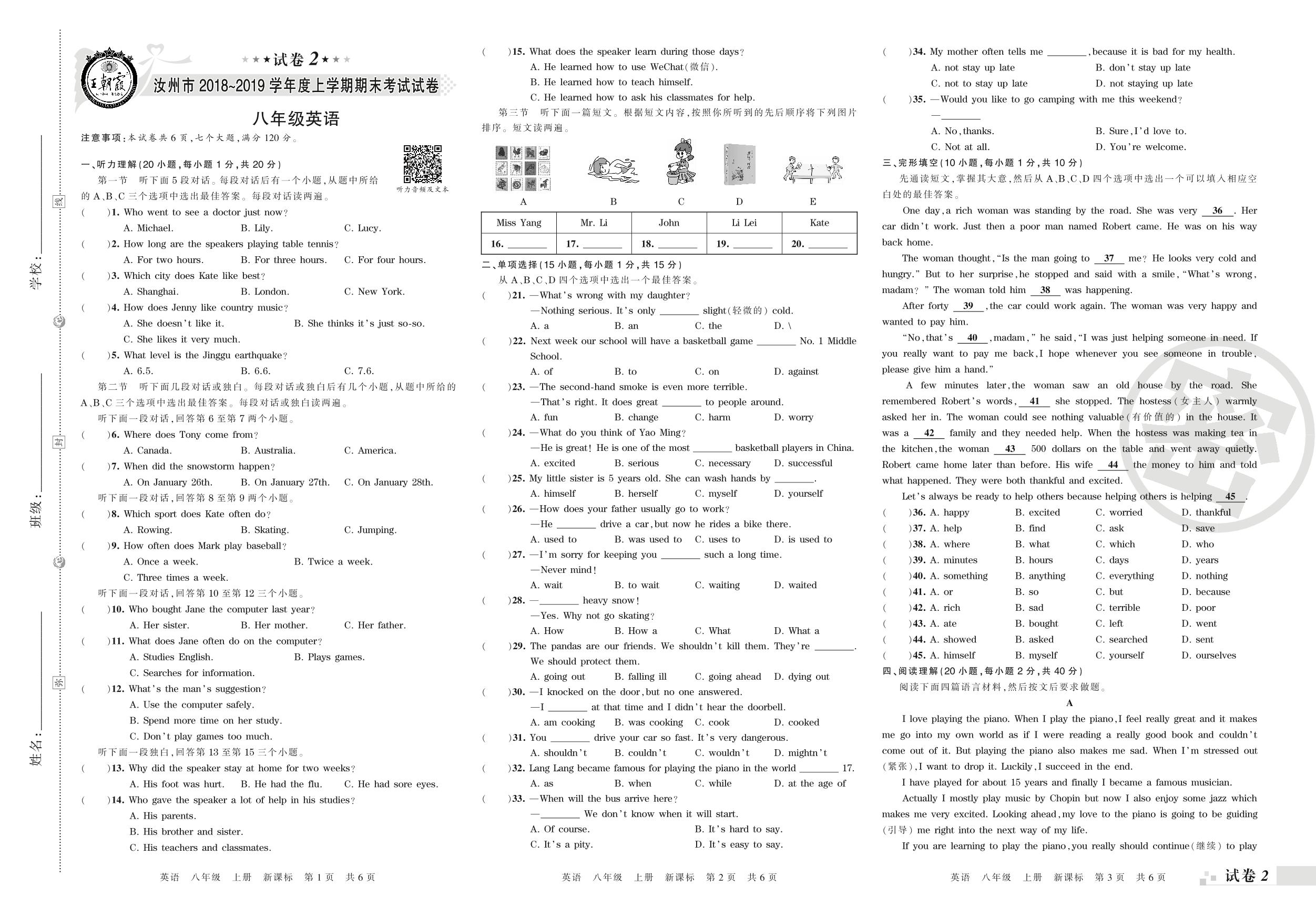 2018-2019学年第一学期汝州市八年级英语试卷(新课版)【2】