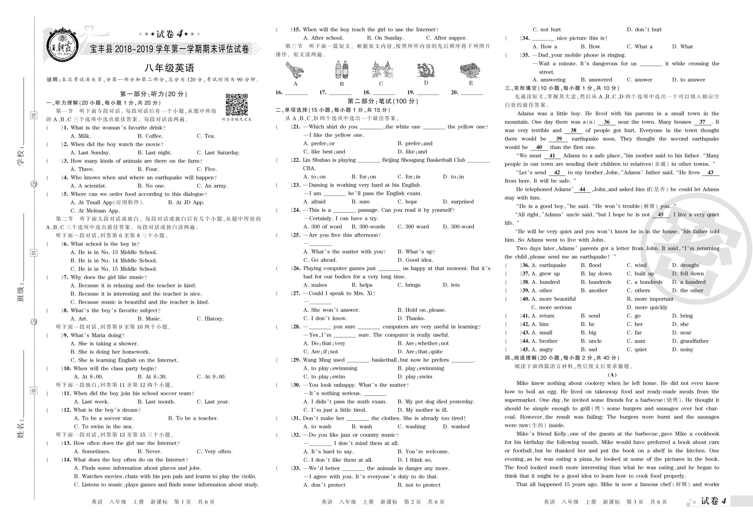 2018-2019学年第一学期平顶山市宝丰县八年级英语试卷(新课版)【4】