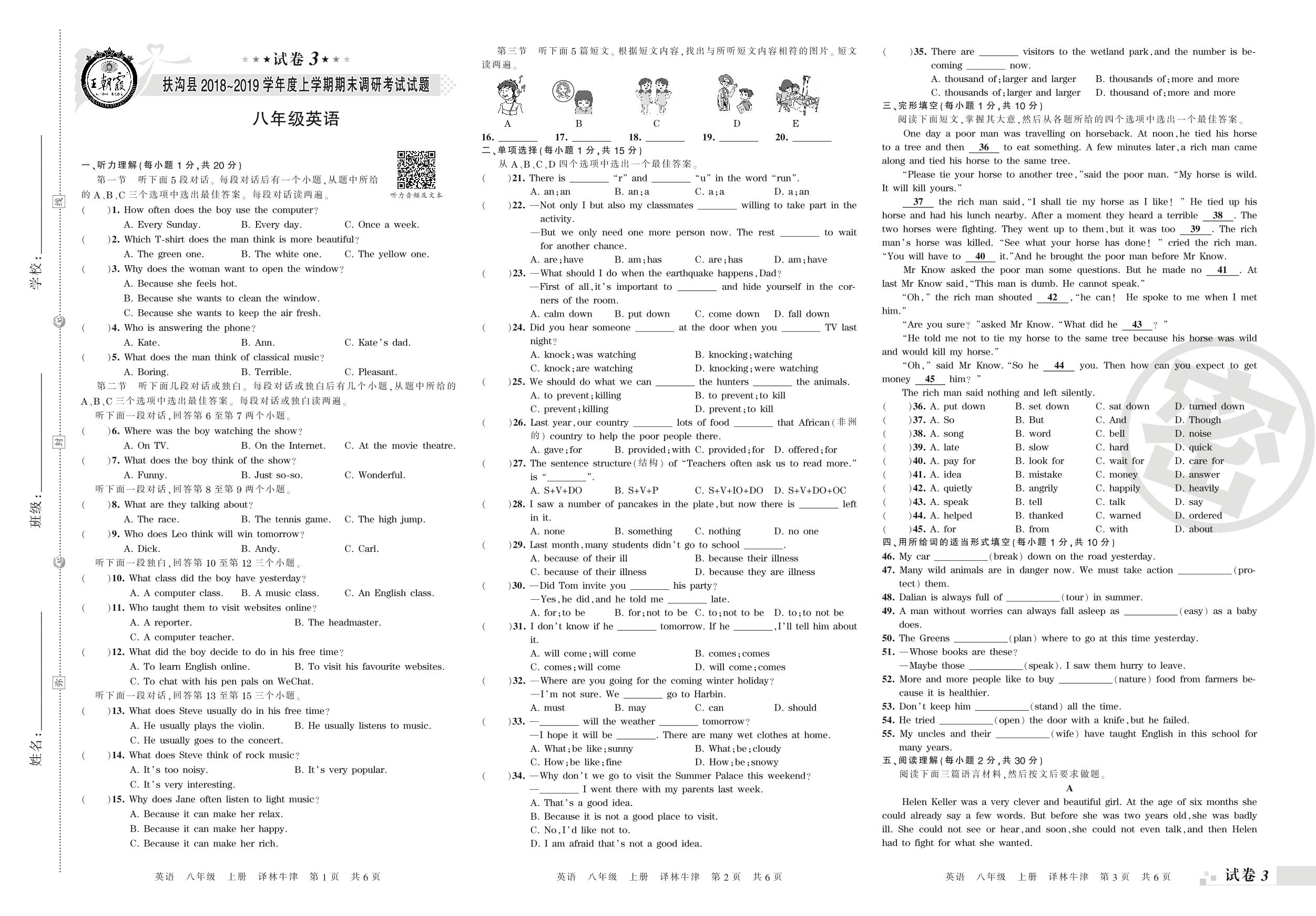 2018-2019学年第一学期周口市扶沟县八年级英语试卷(译林版)【3】