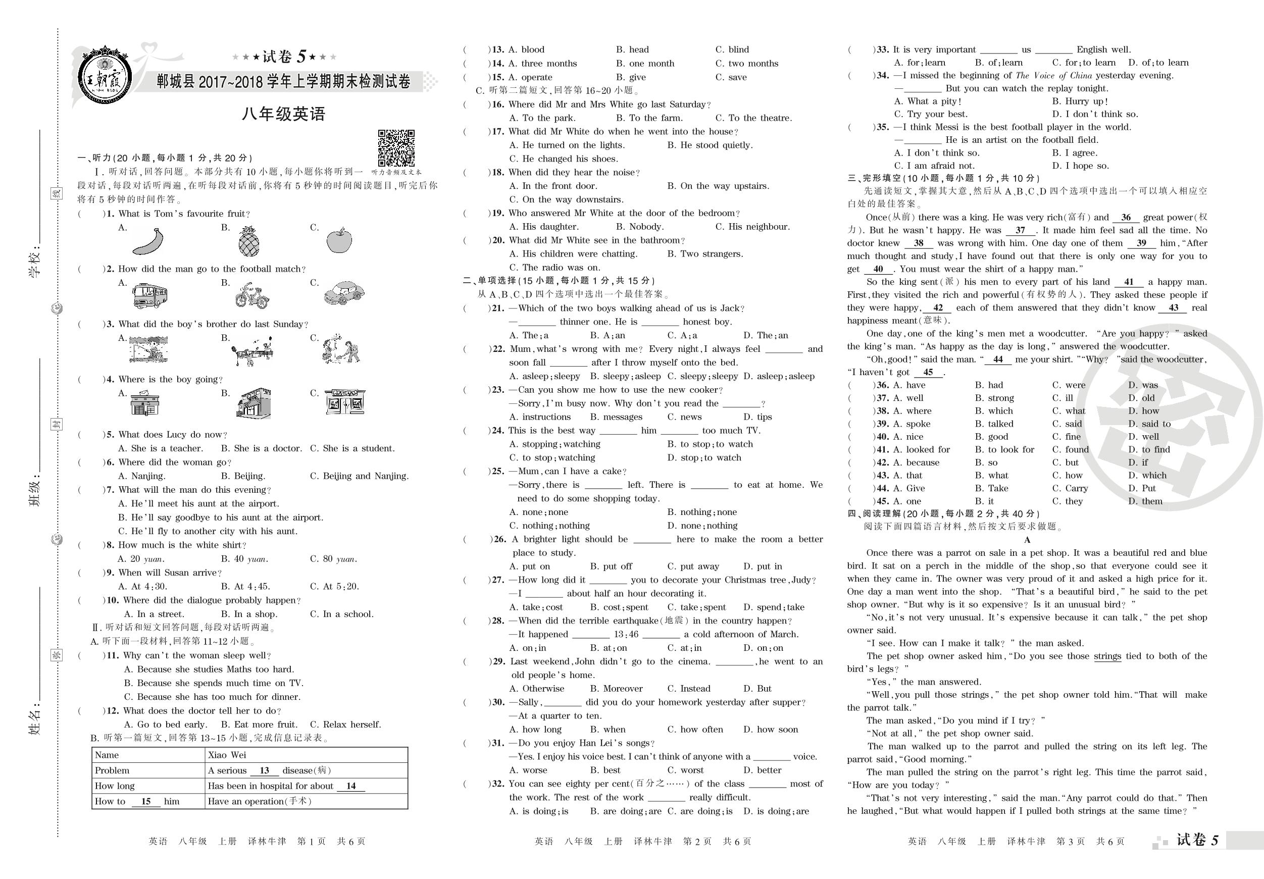 2017-2018学年第一学期周口市郸城县八年级英语试卷(译林版)【5】