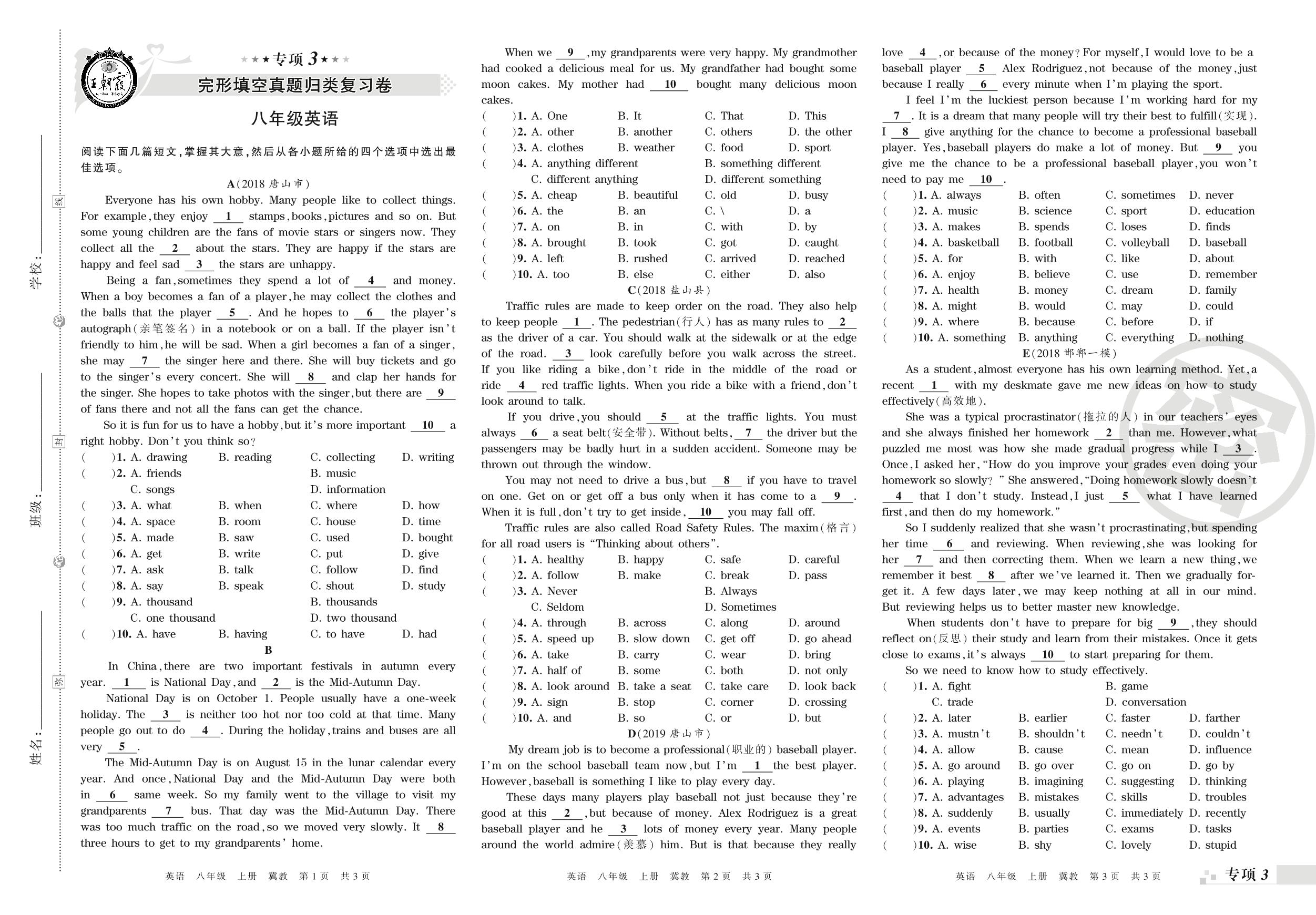 王朝霞期末专项卷——完形填空、阅读理解真题归类复习八年级上册英语(冀教版)_R210809110356【0】