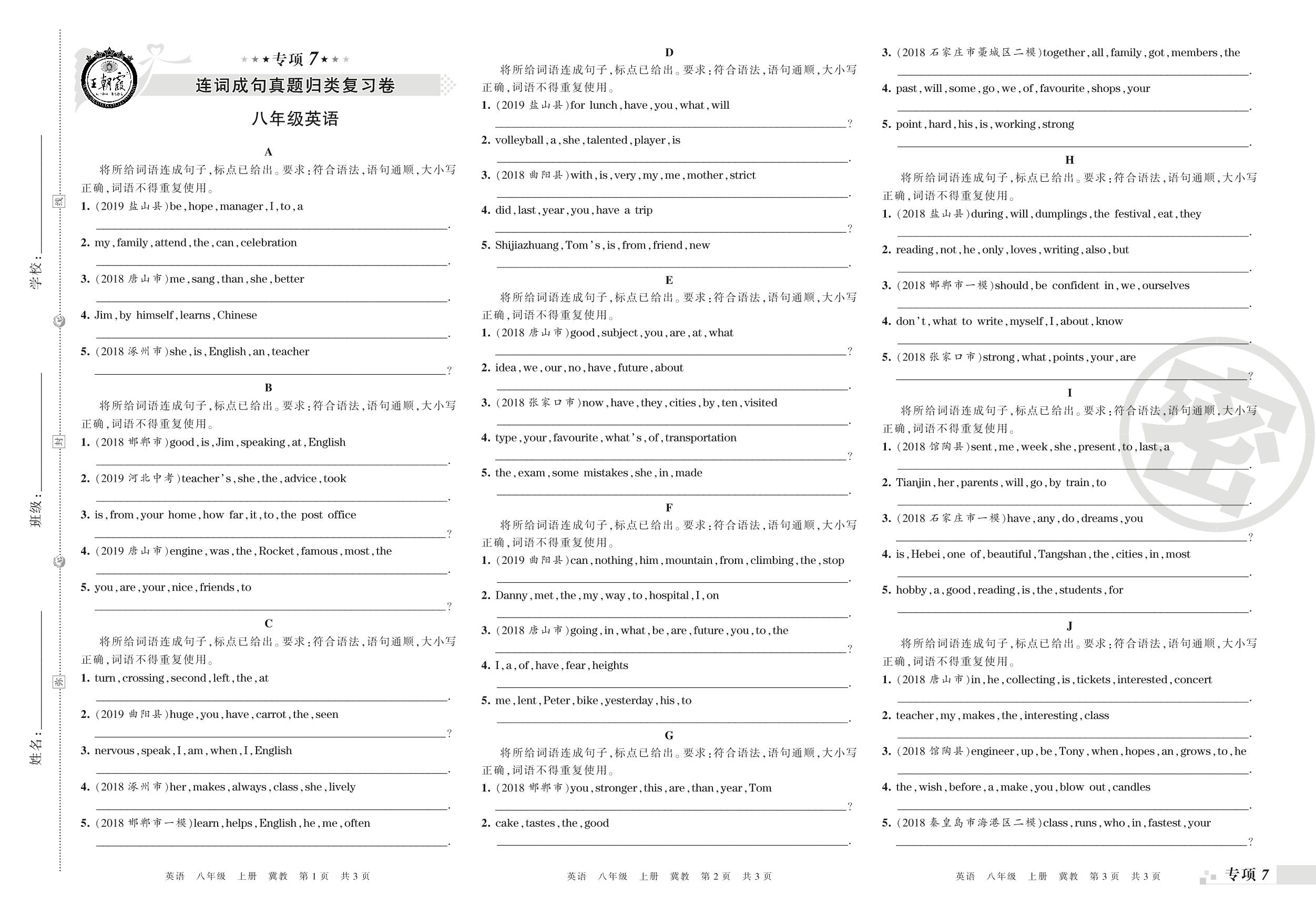 王朝霞期末专项卷——连词成句、书面表达真题归类复习八年级上册英语(冀教版)_R210809110412【0】