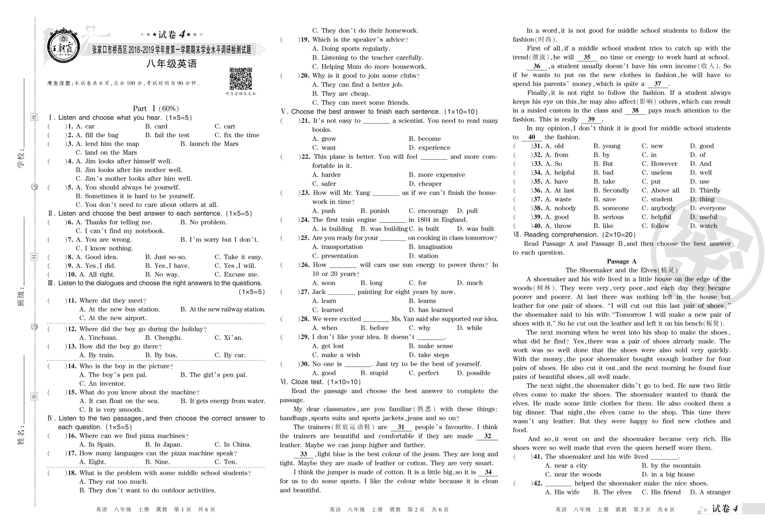 2018-2019学年第一学期张家口市桥西区八年级英语试卷(冀教版)【4】