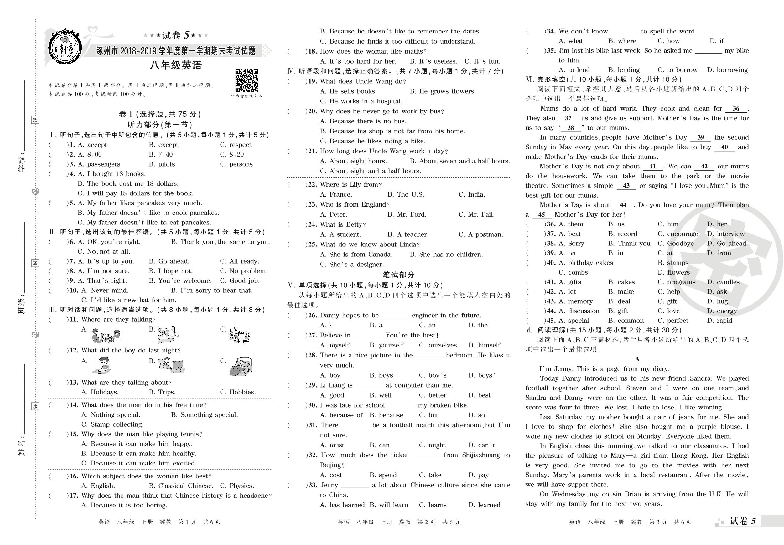 2018-2019学年第一学期涿州市八年级英语试卷(冀教版)【5】