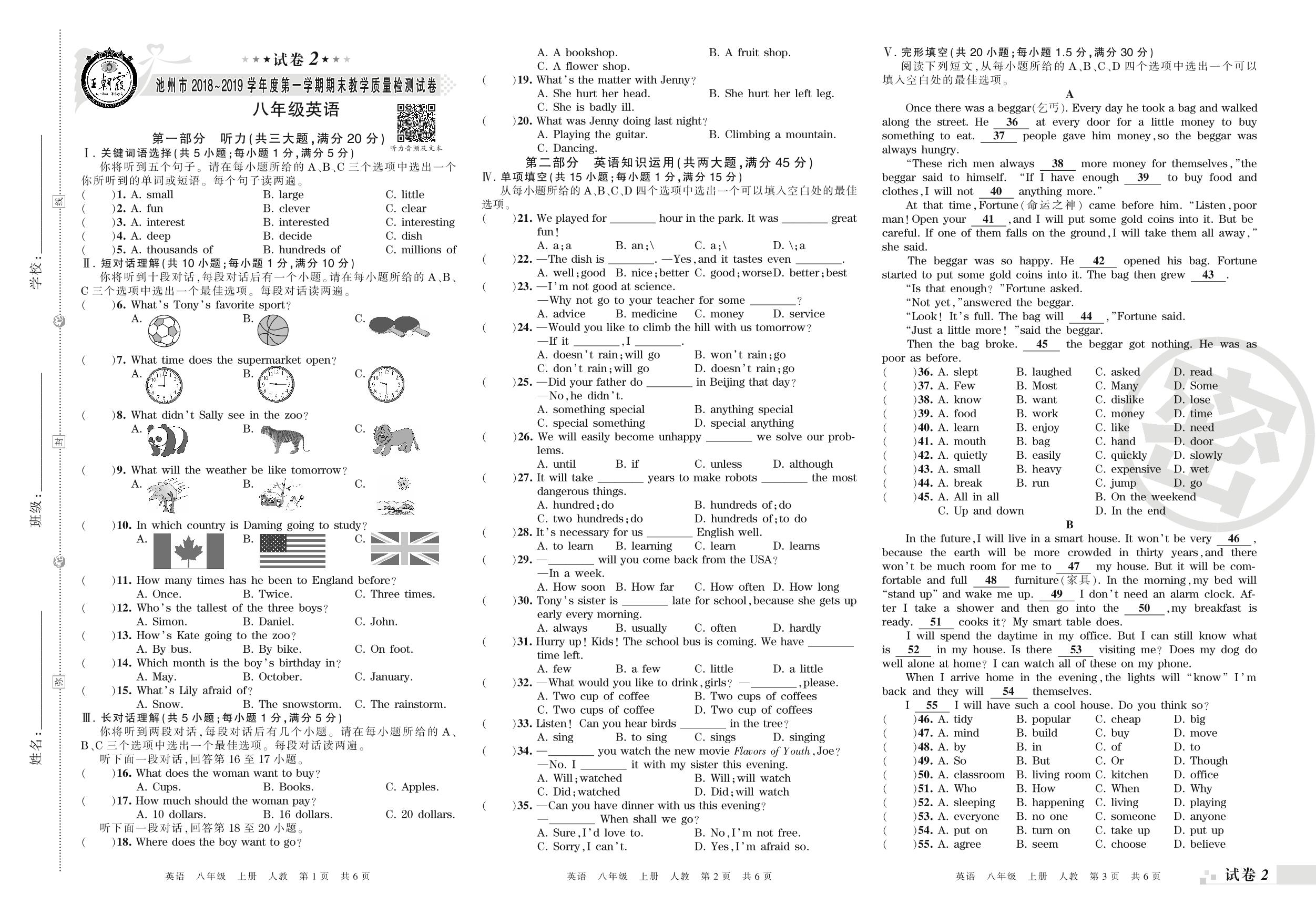 2018-2019学年第一学期池州市八年级英语试卷(人教版)【2】