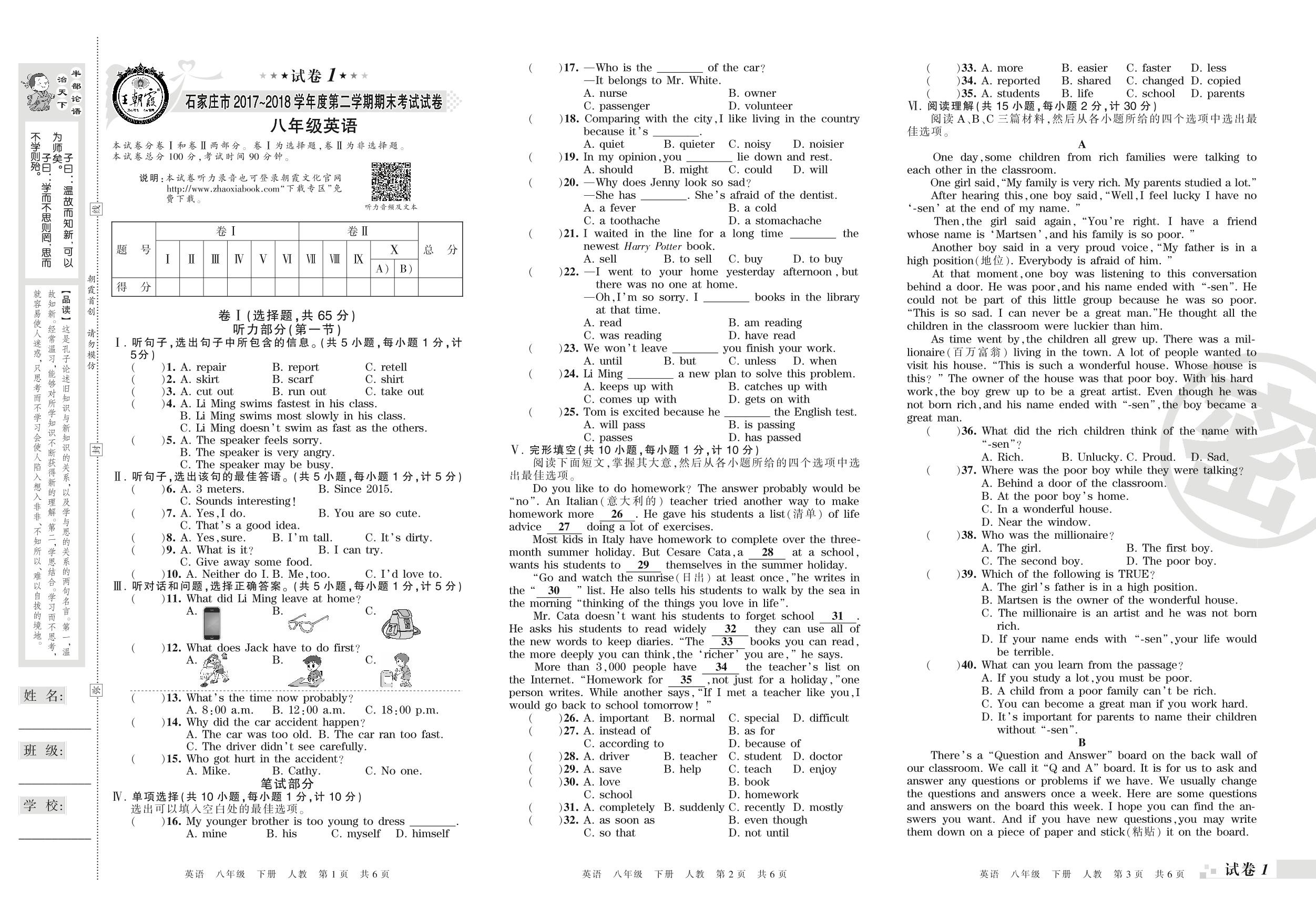 2017-2018学年第二学期石家庄市八年级英语试卷(人教版)【1】