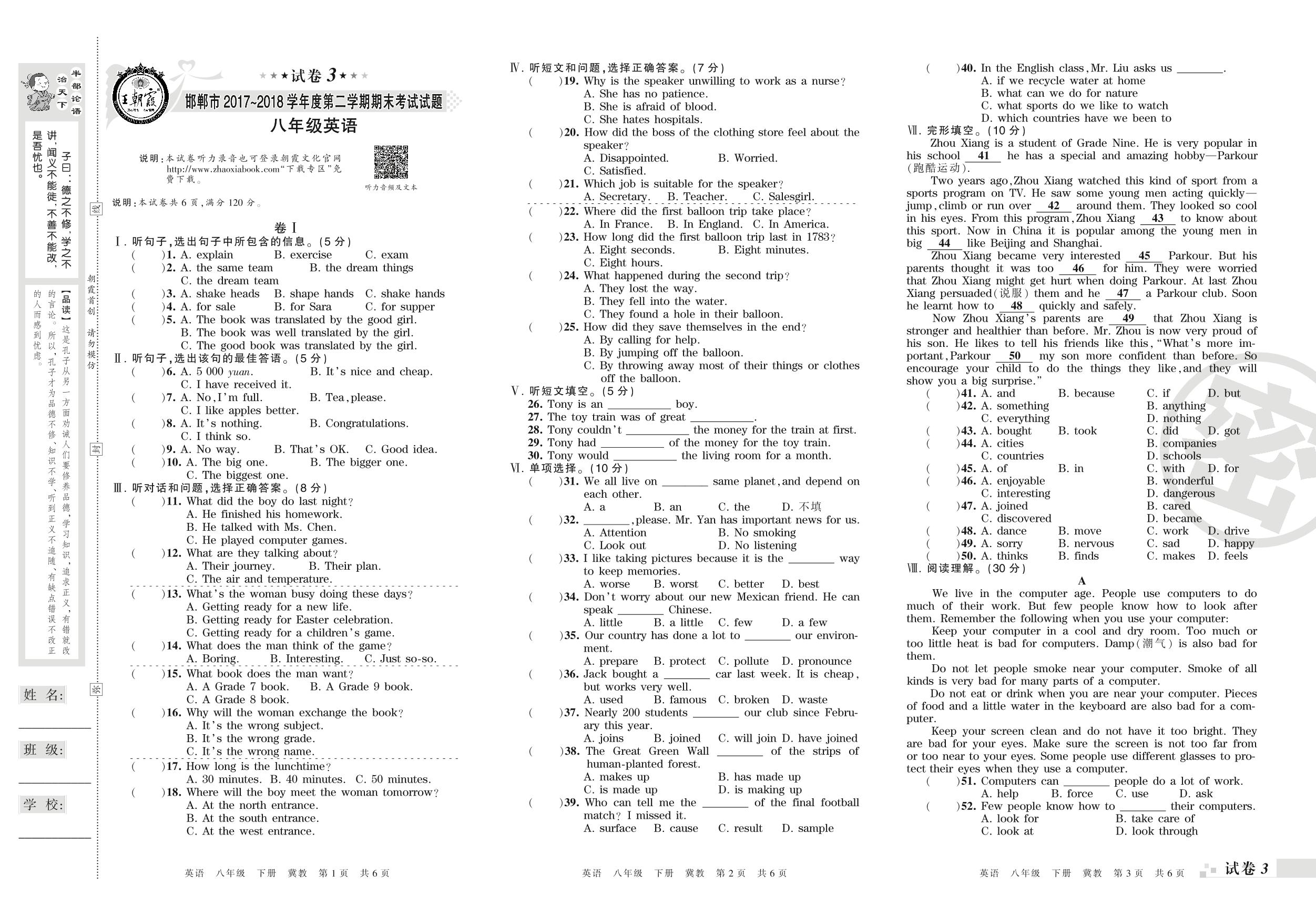 2017-2018学年第二学期邯郸市八年级英语试卷(冀教版)【3】