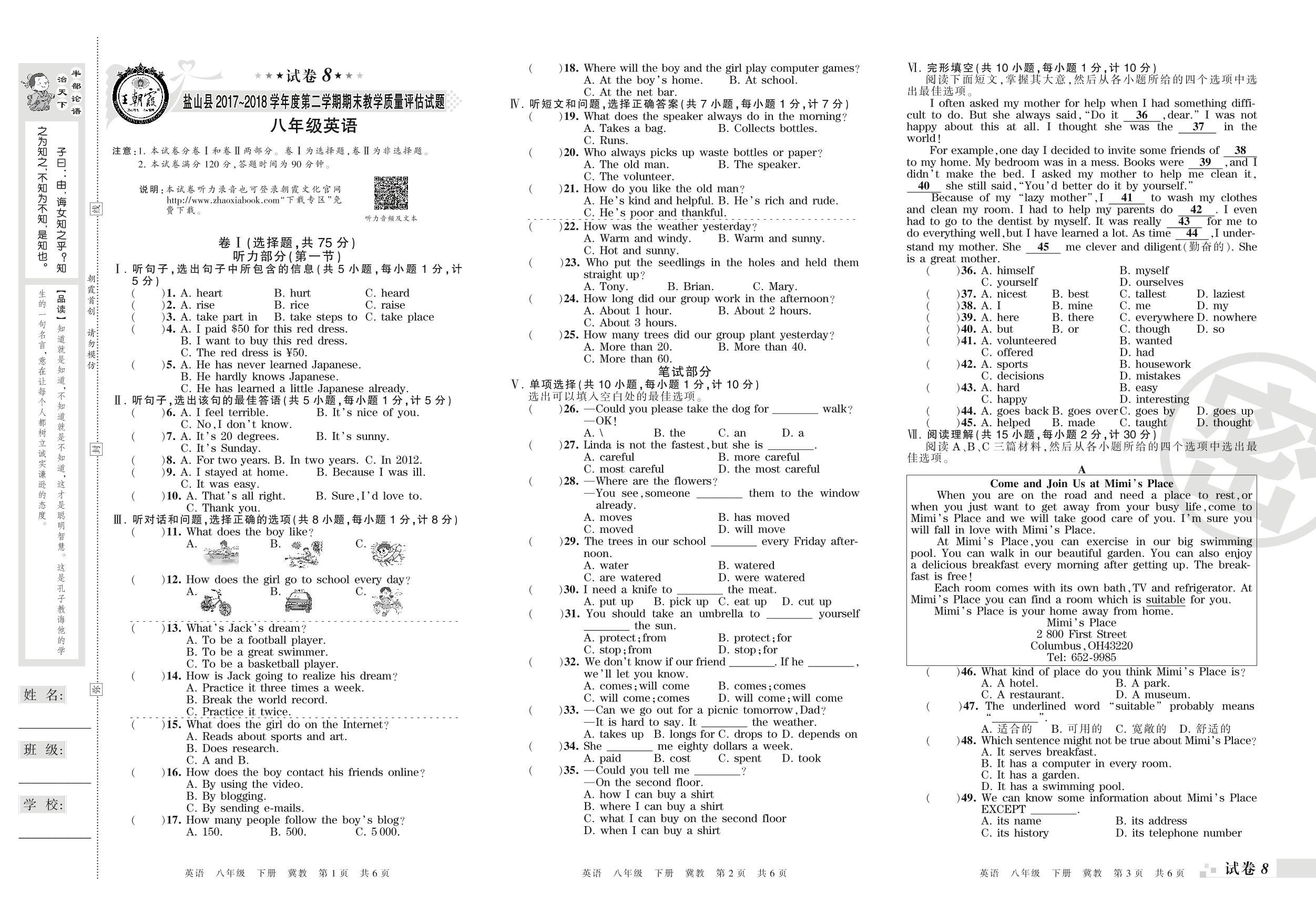 2017-2018学年第二学期沧州市盐山县八年级英语试卷(冀教版)【8】
