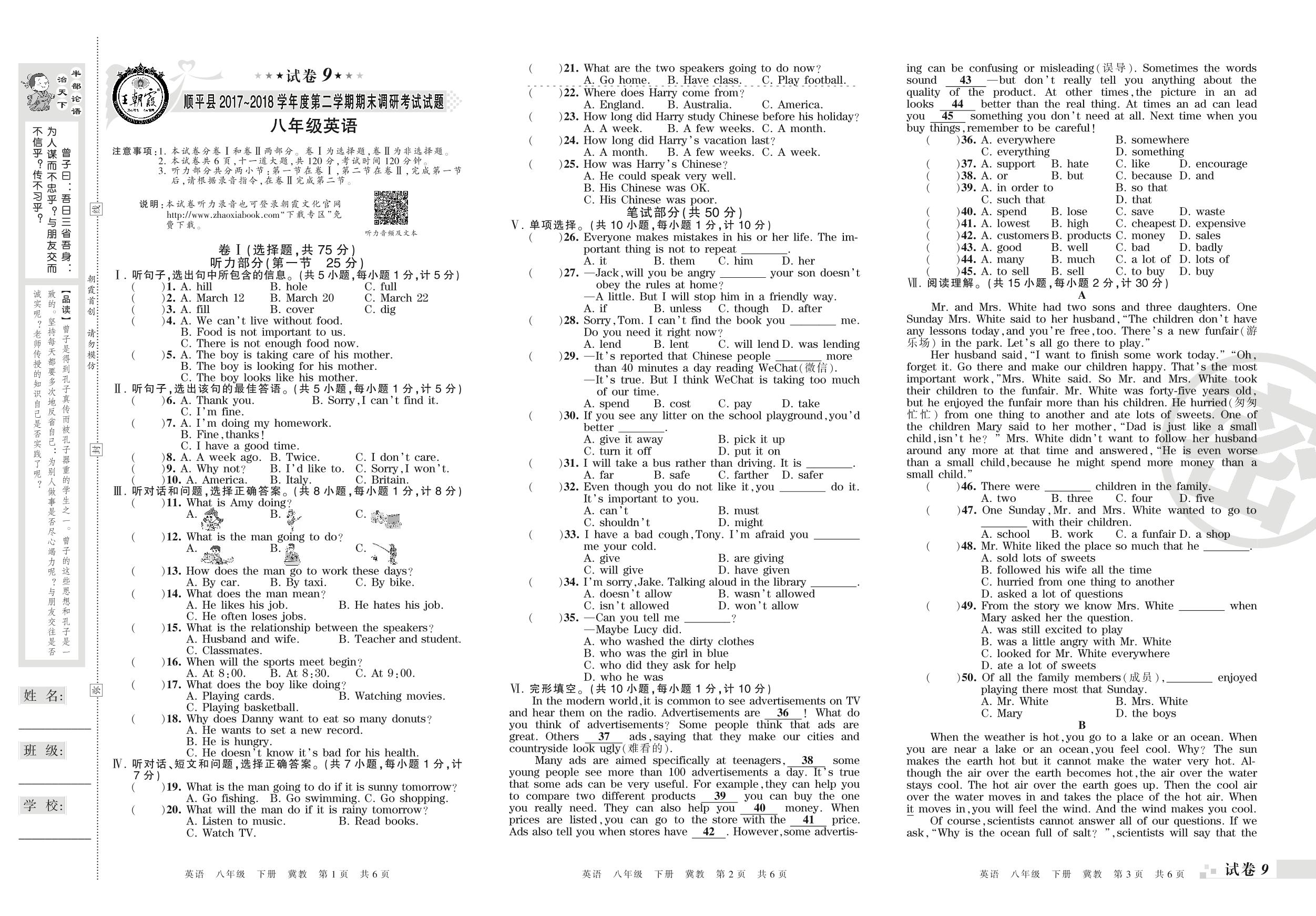 2017-2018学年第二学期保定市顺平县八年级英语试卷(冀教版)【9】