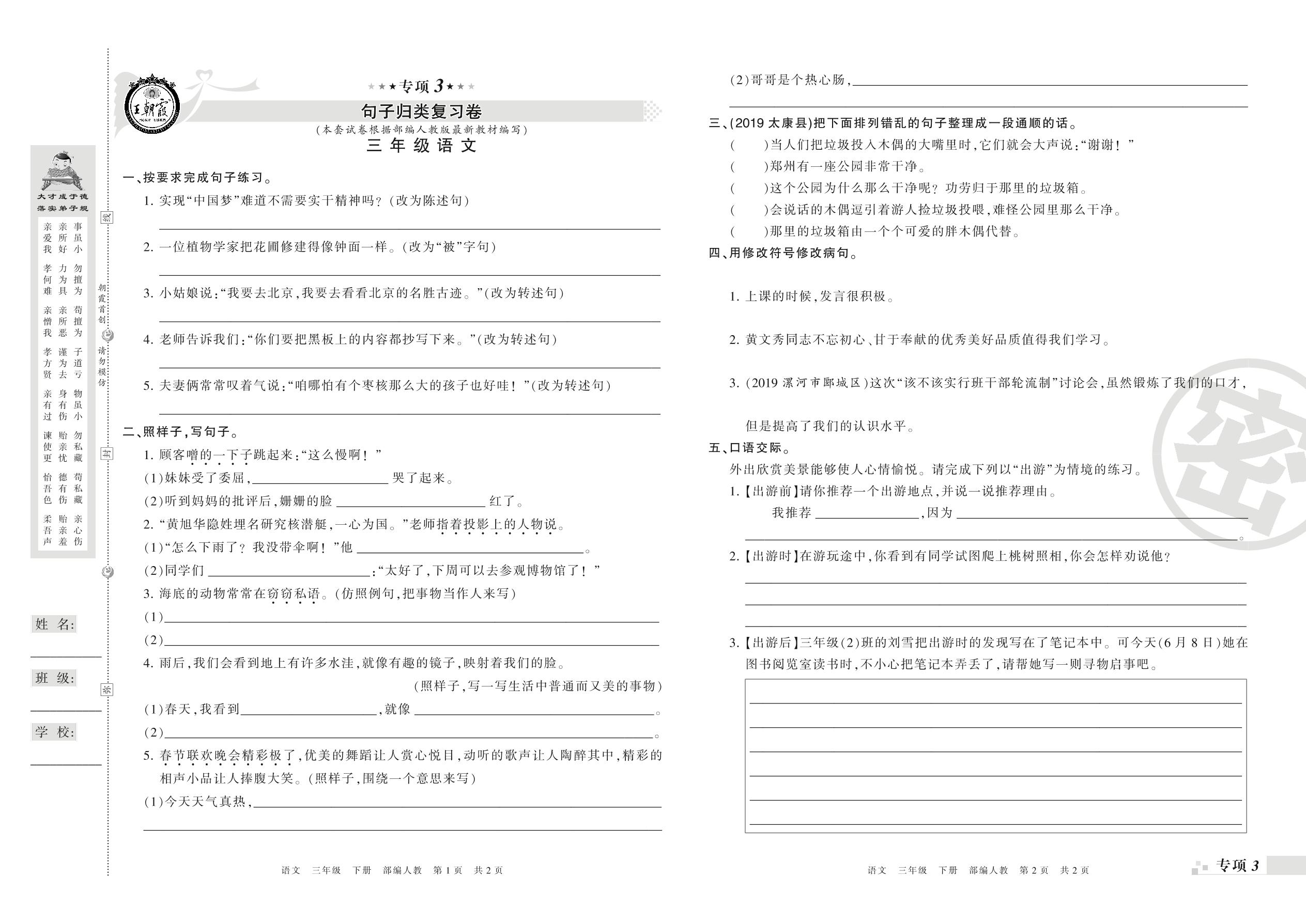 王朝霞期末专项卷——句子、课文内容与积累运用真题归类复习卷三年级下册语文(人教版)_R21080191515【0】