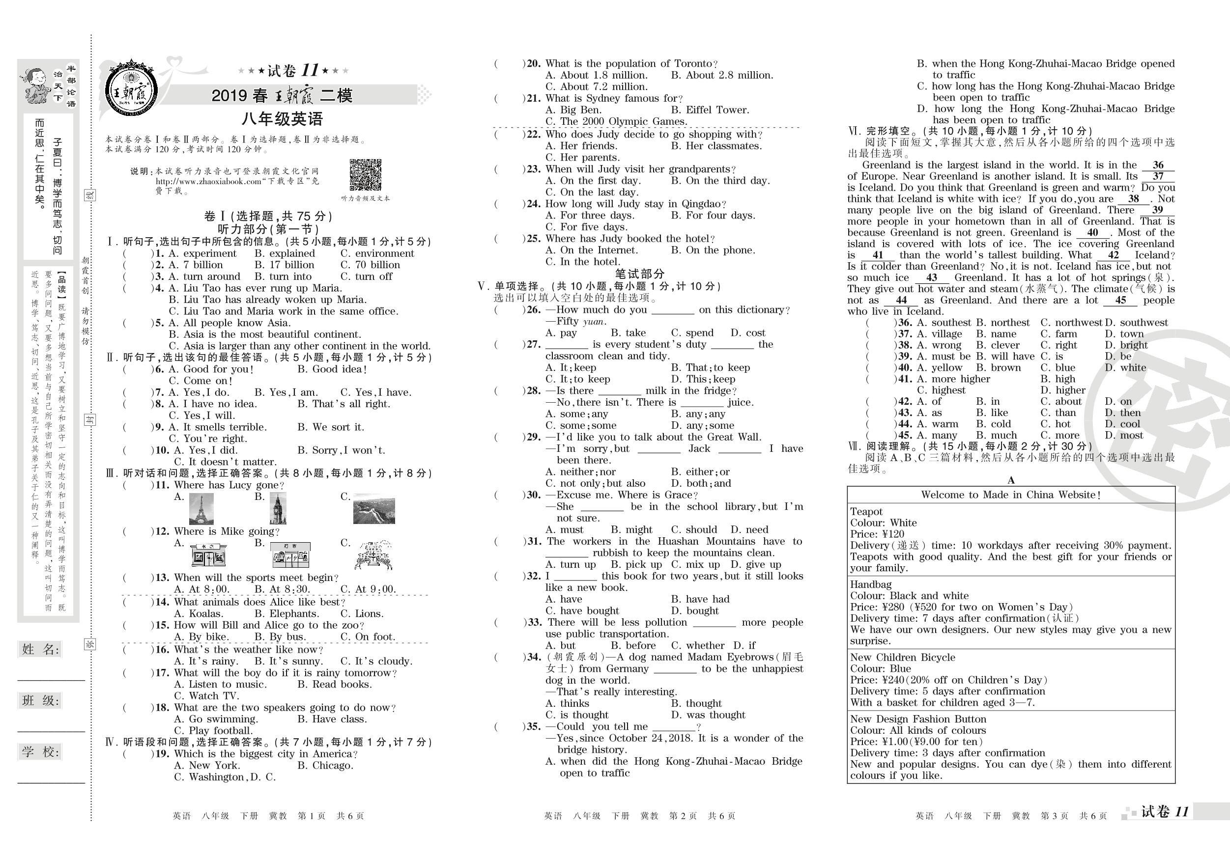 王朝霞期末模拟卷八年级下册英语(冀教版)_R210809111357【11】