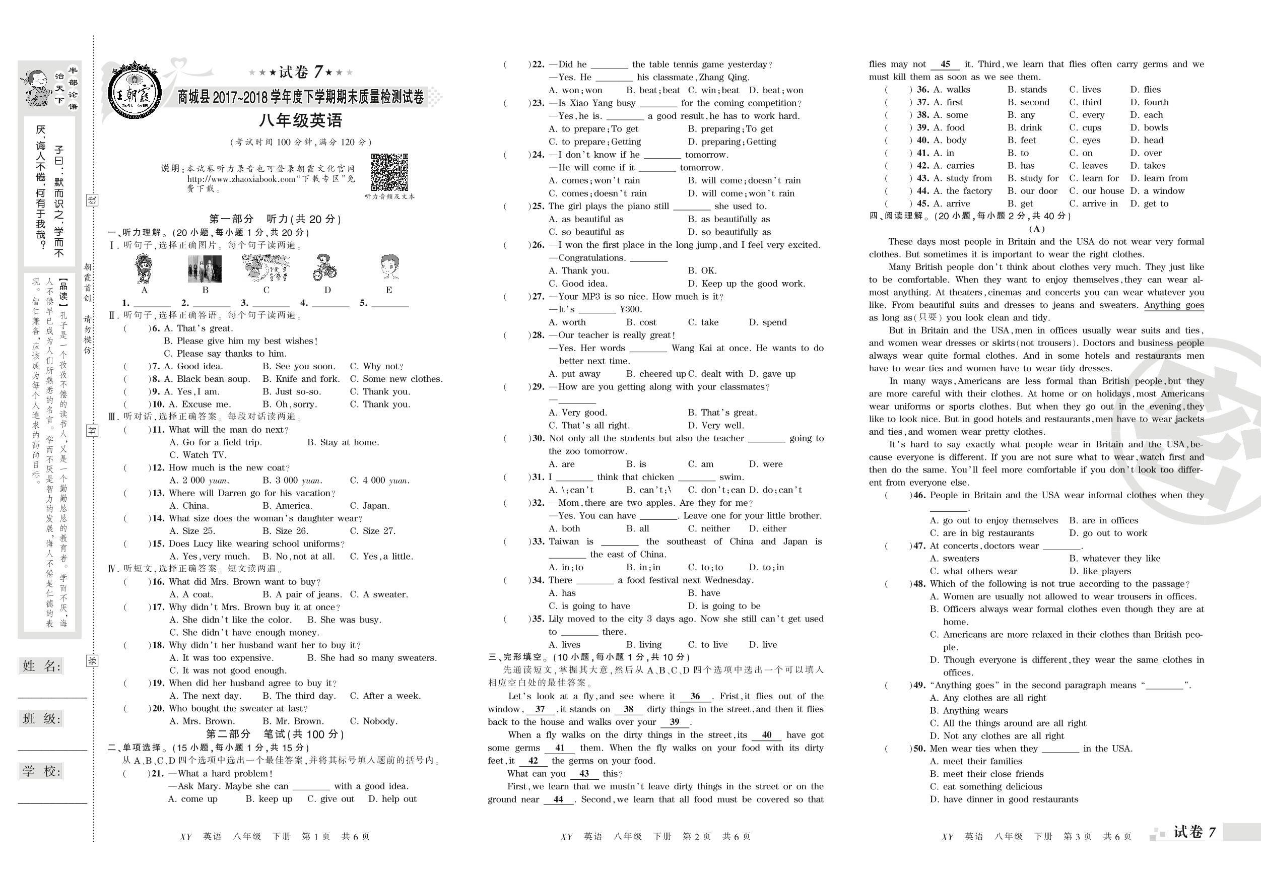 2017-2018学年第二学期信阳市商城县八年级英语试卷(新课版)【7】