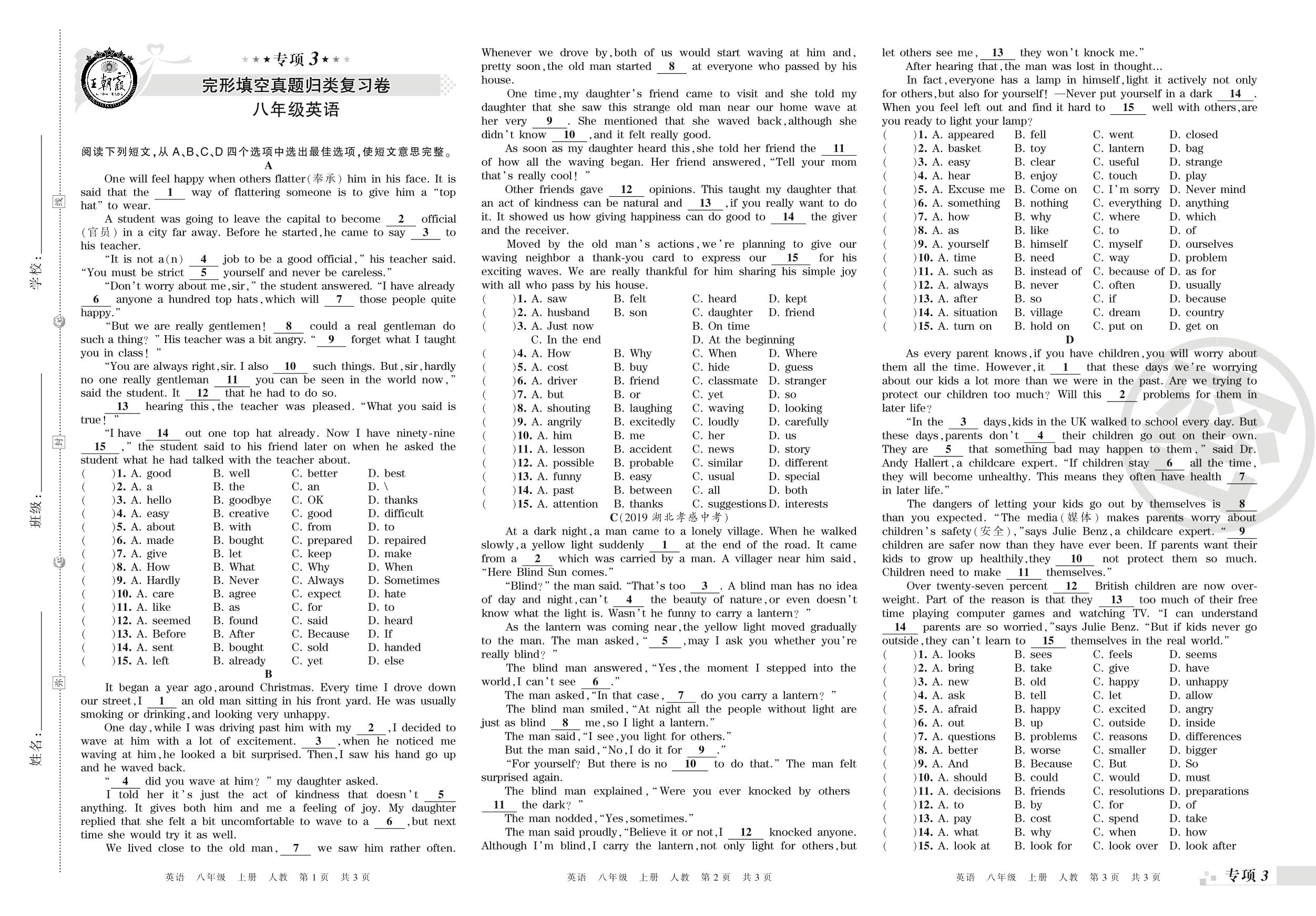 王朝霞期末专项卷——完形填空、选择型阅读真题归类复习八年级上册英语(人教版)_R210809111642【0】