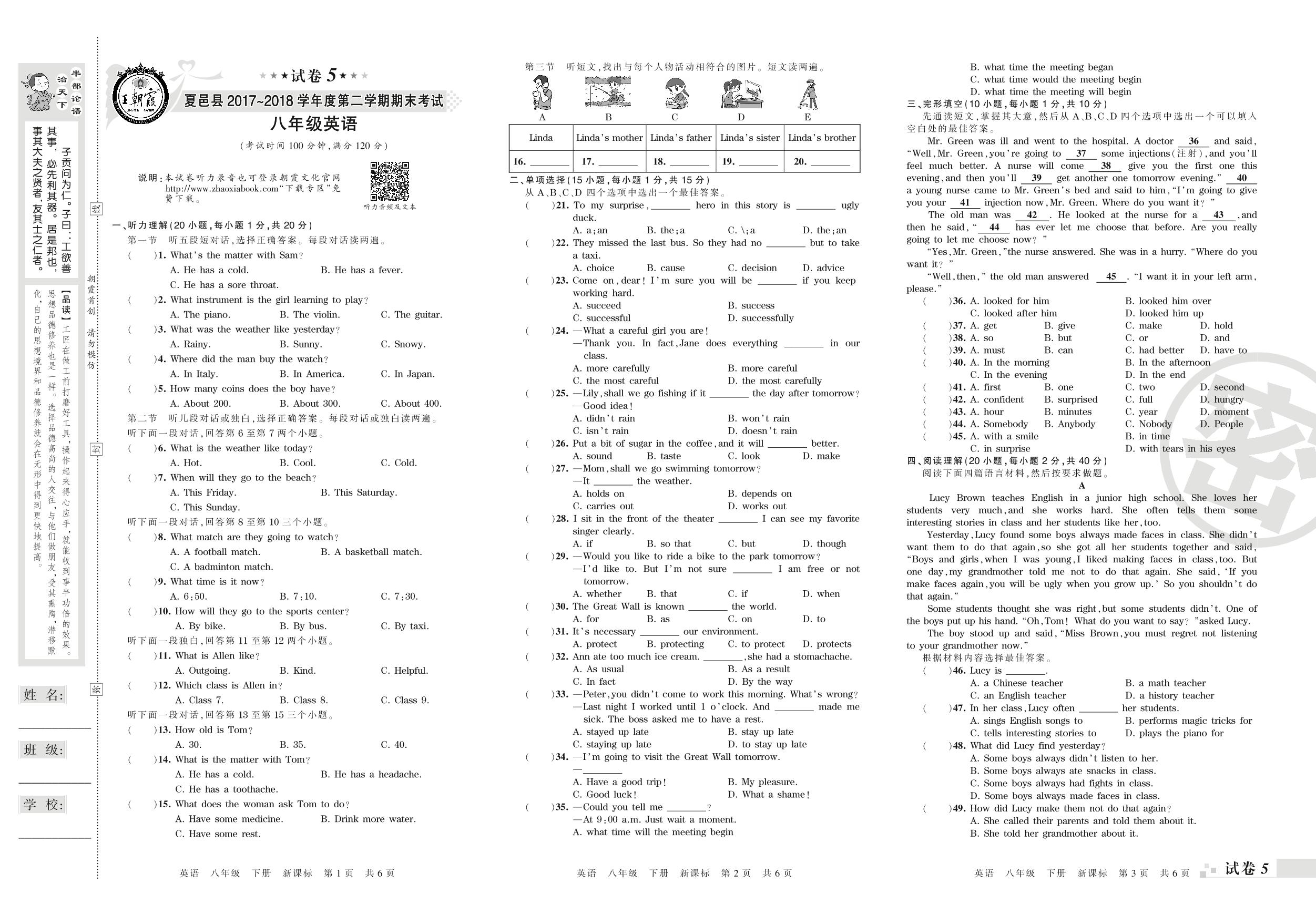 2017-2018学年第二学期商丘市夏邑县八年级英语试卷(新课版)【5】
