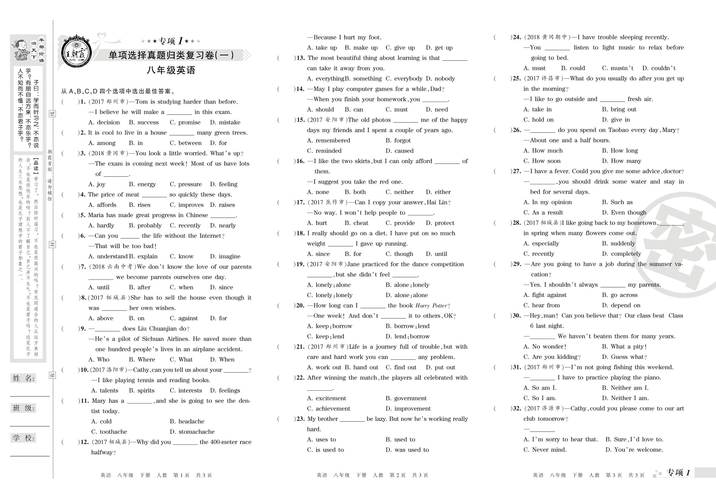 王朝霞期末专项卷——单项选择(一)(二)真题归类复习卷八年级下册英语(人教版)_R210809112011【0】