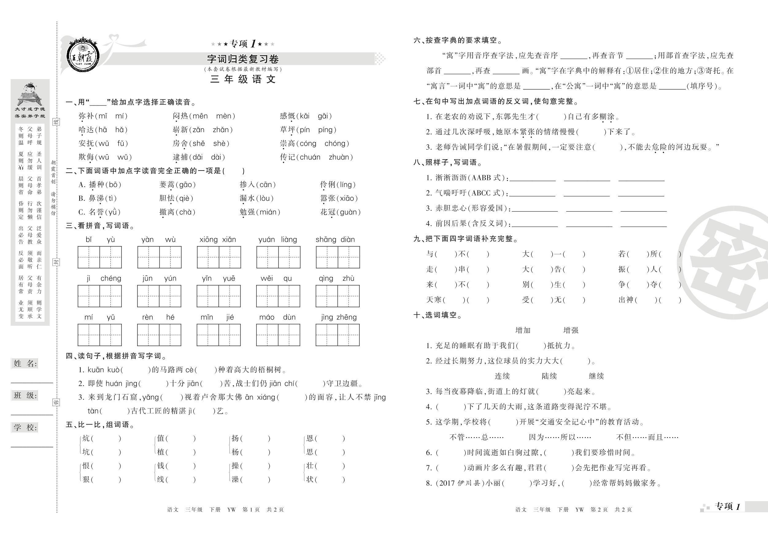 王朝霞期末专项卷——字词、句子归类复习三年级下册语文(语文版)【0】