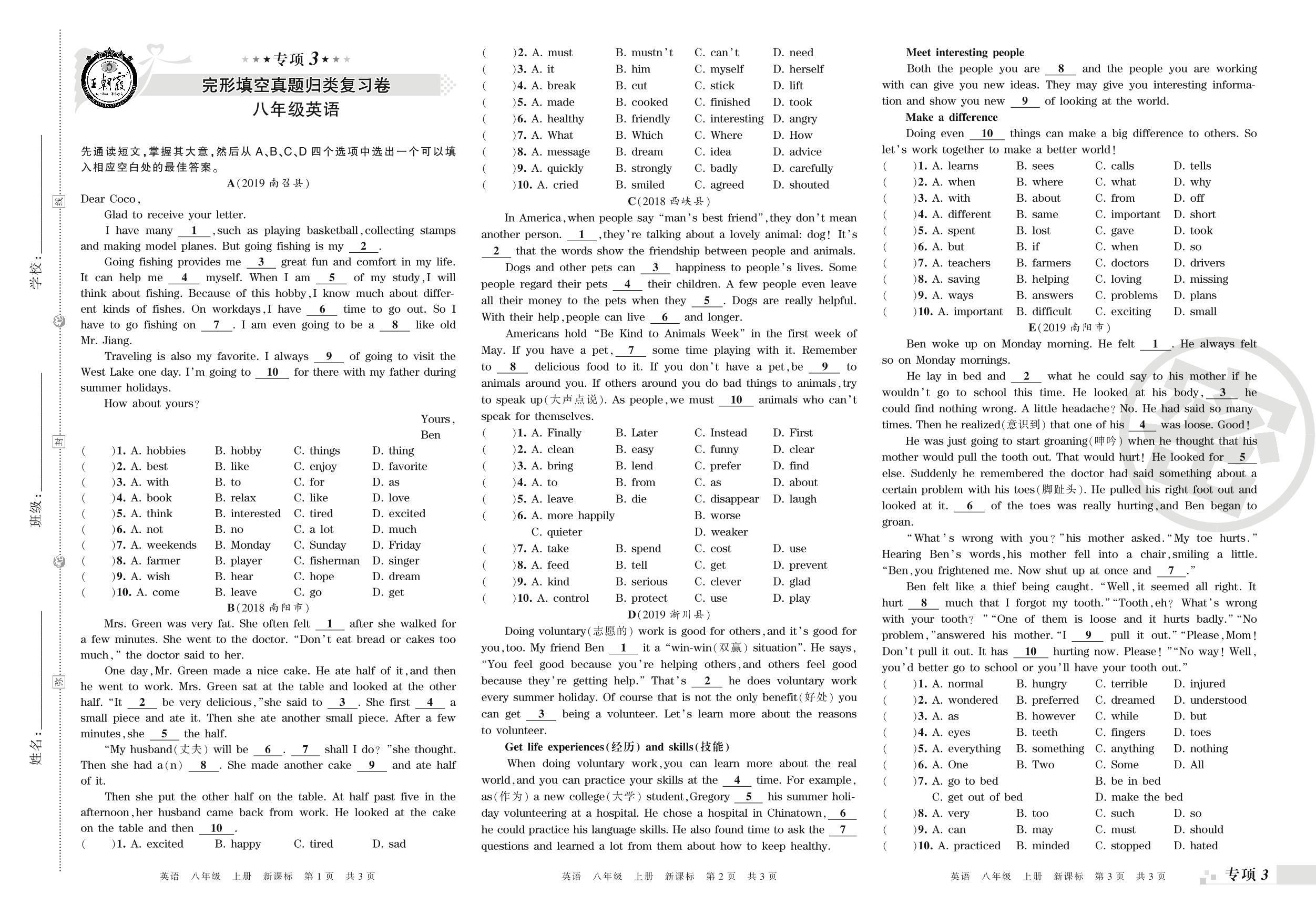 王朝霞期末专项卷——完形填空、选择型阅读真题归类复习八年级上册英语(新课版)_R210809112209【0】