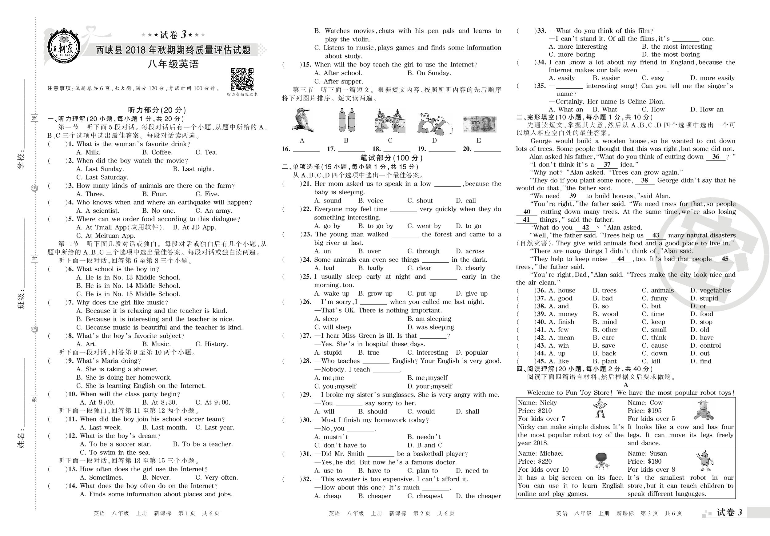 2018-2019学年第一学期南阳市西峡县八年级英语试卷(新课版)【3】