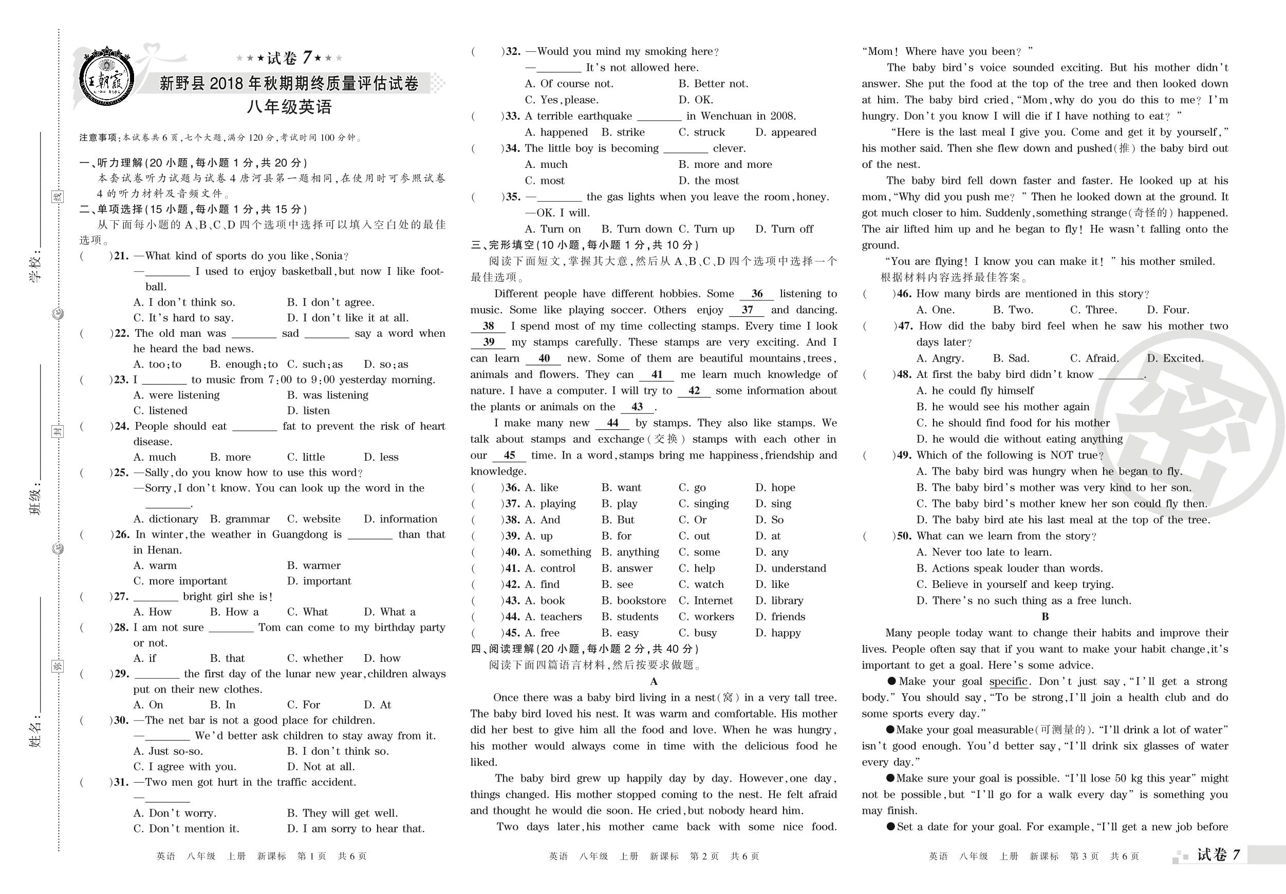2018-2019学年第一学期南阳市新野县八年级英语试卷(新课版)【7】