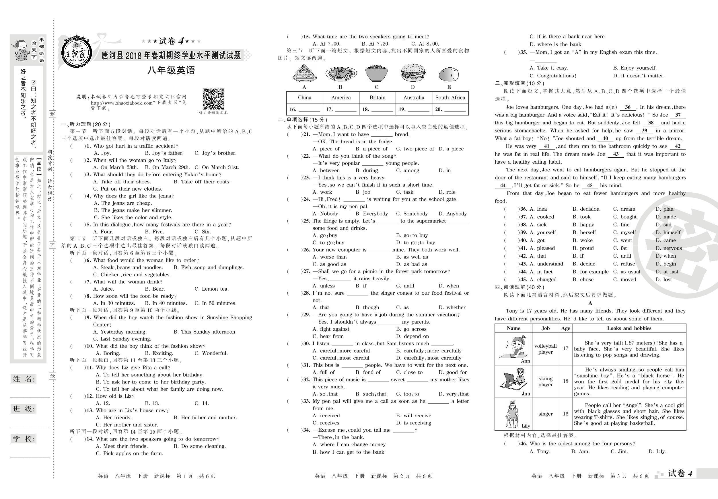 2017-2018学年第二学期南阳市唐河县八年级英语试卷(新课版)【4】