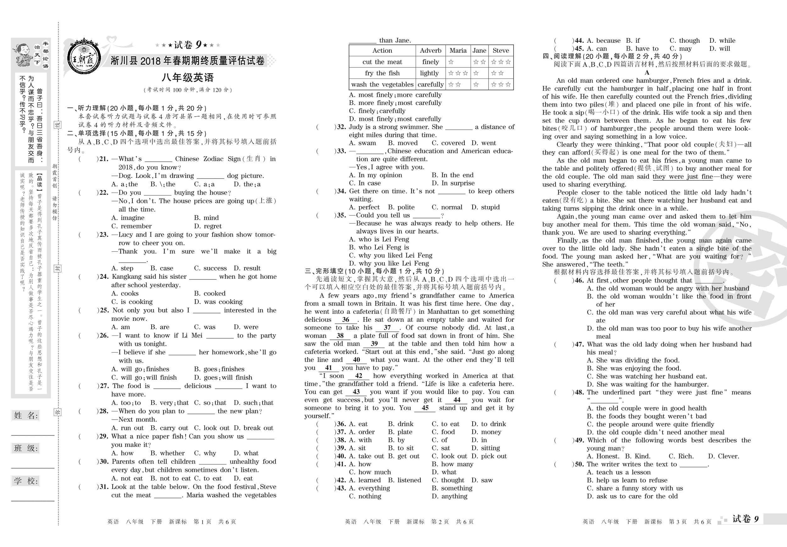 2017-2018学年第二学期南阳市淅川县八年级英语试卷(新课版)【9】