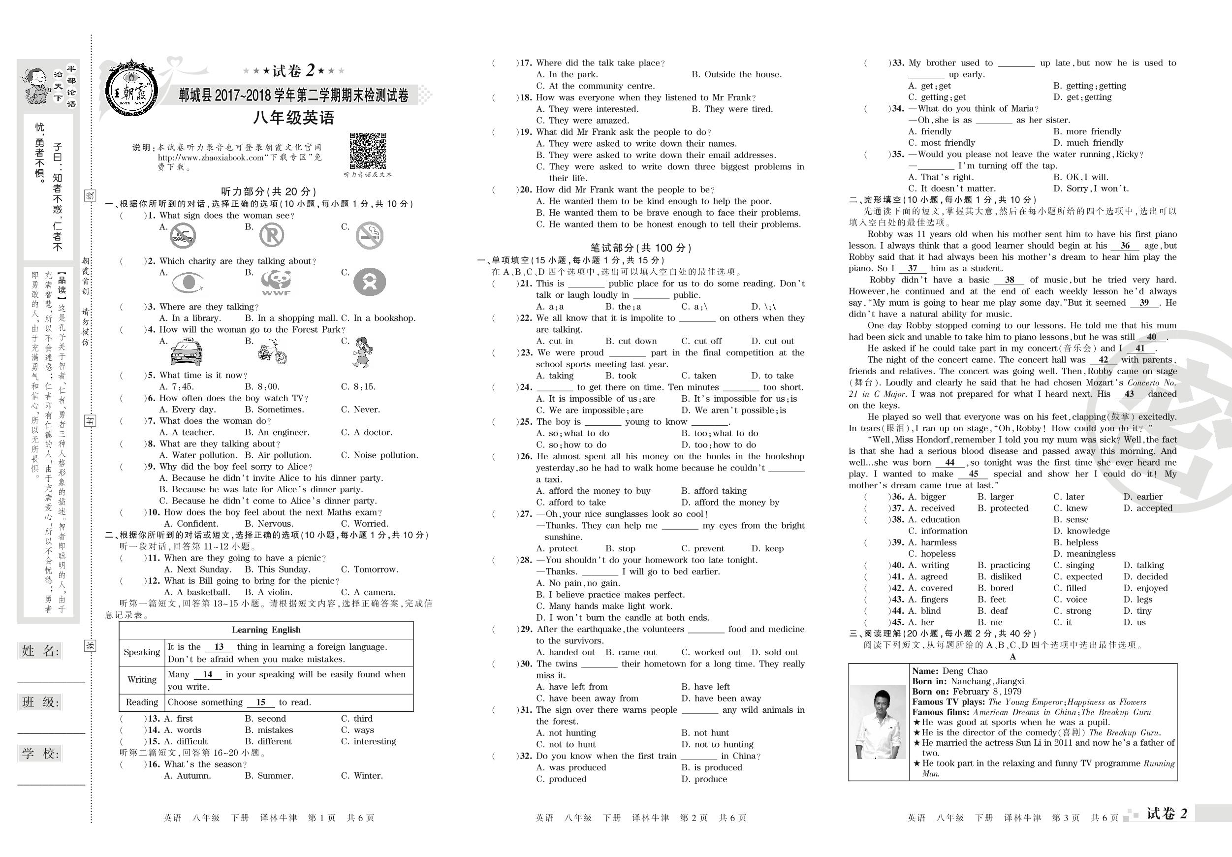 2017-2018学年第二学期周口市郸城县八年级英语试卷(译林版)【2】