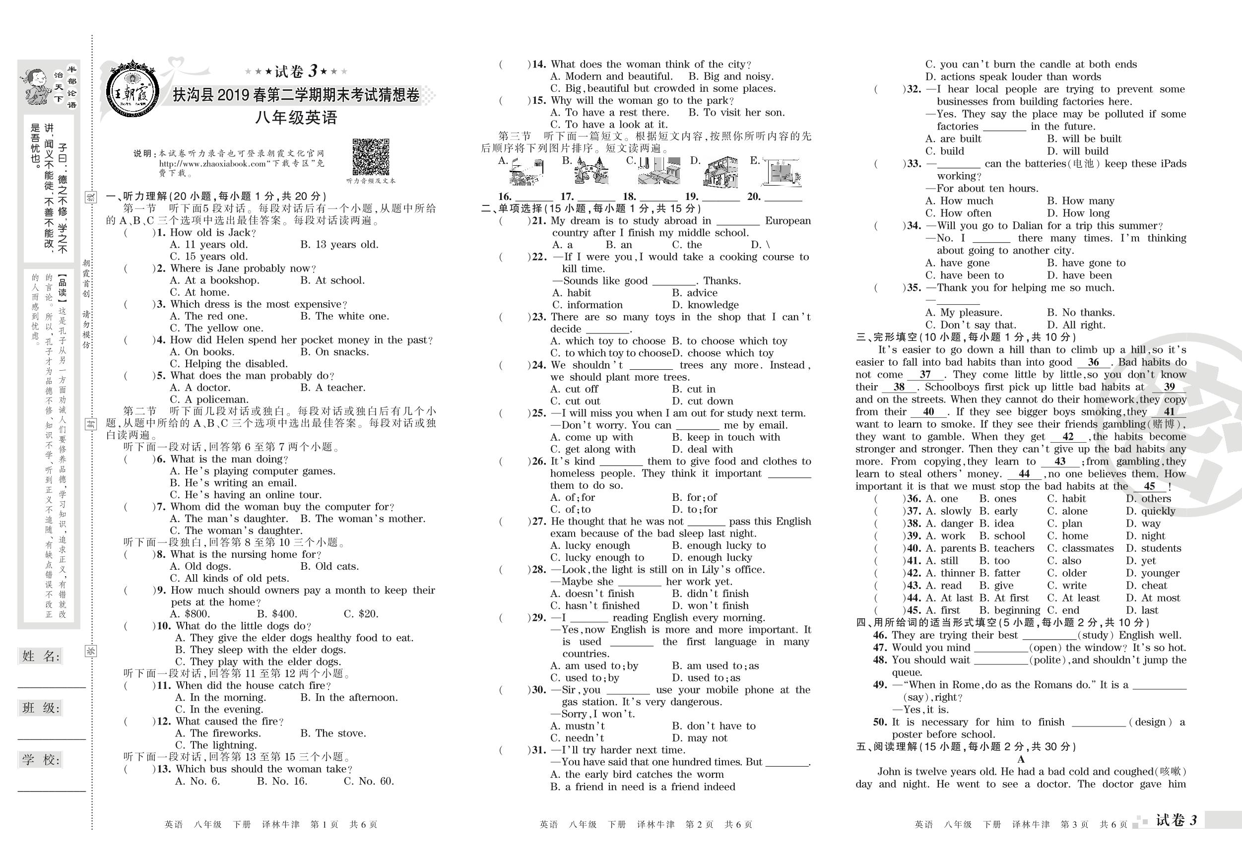 2018-2019学年第二学期周口市扶沟县猜想卷八年级英语试卷(译林版)【3】