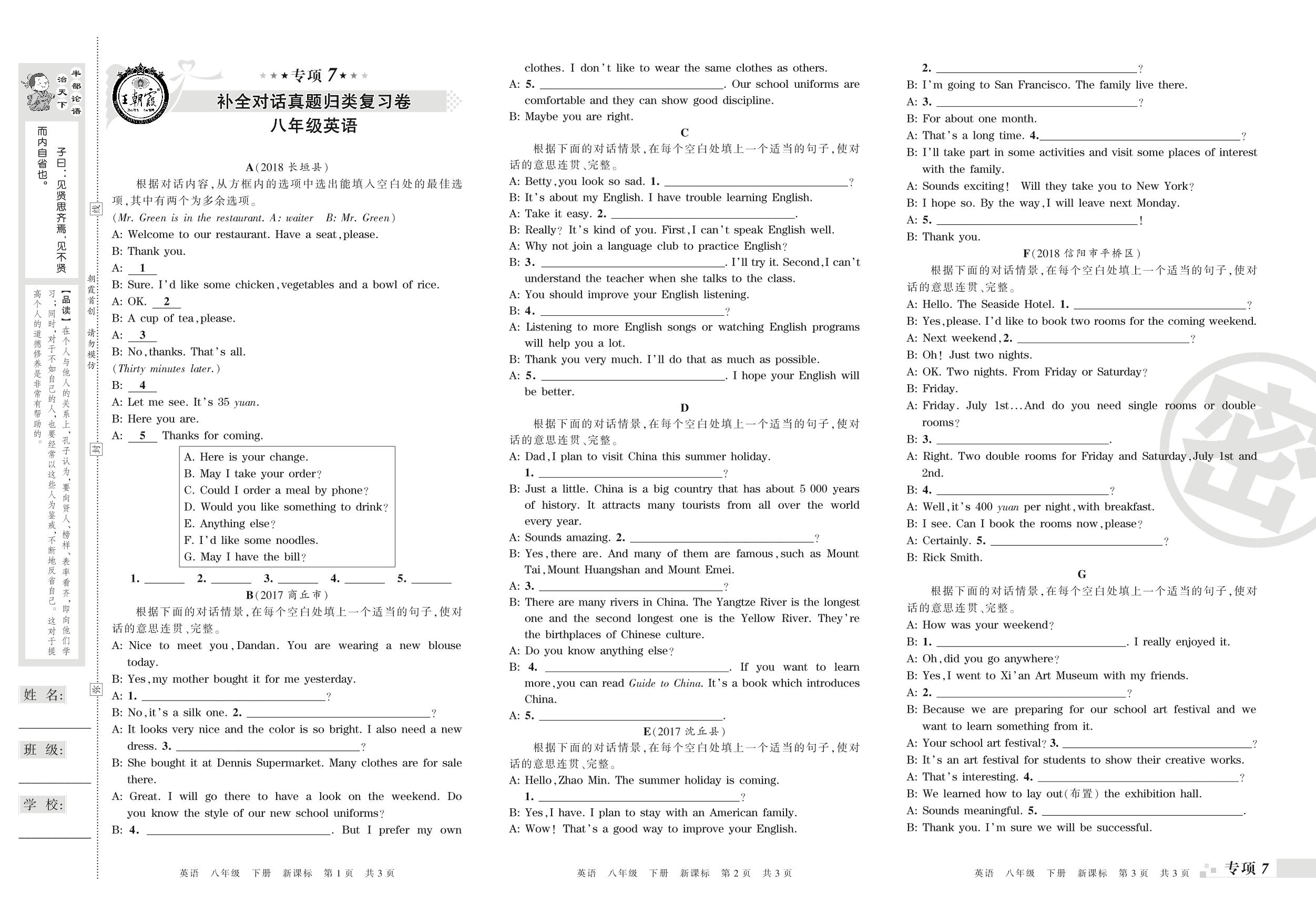 王朝霞期末专项卷——补全对话真题归类复习、书面表达真题归类复习八年级下册英语(新课版)【0】