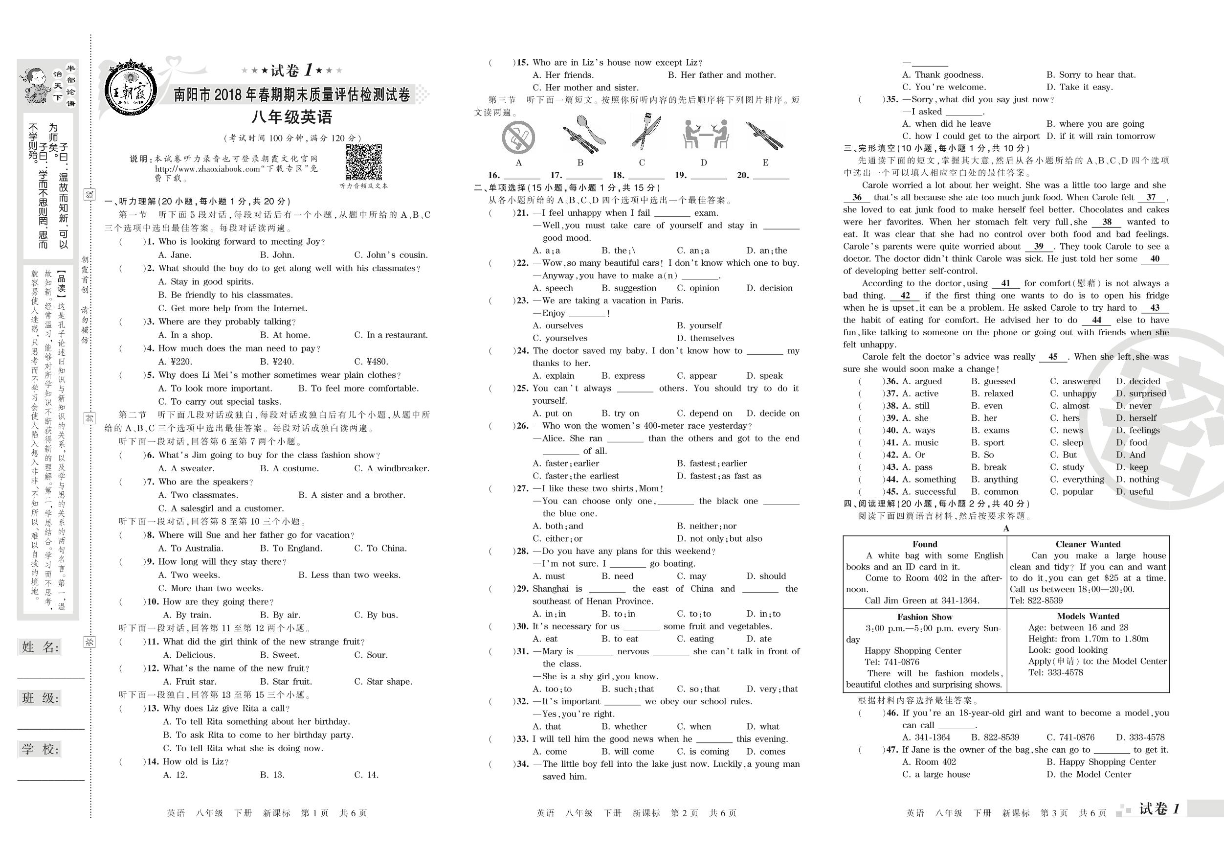 2017-2018学年第二学期南阳市八年级英语试卷(新课版)_R210809112830【1】