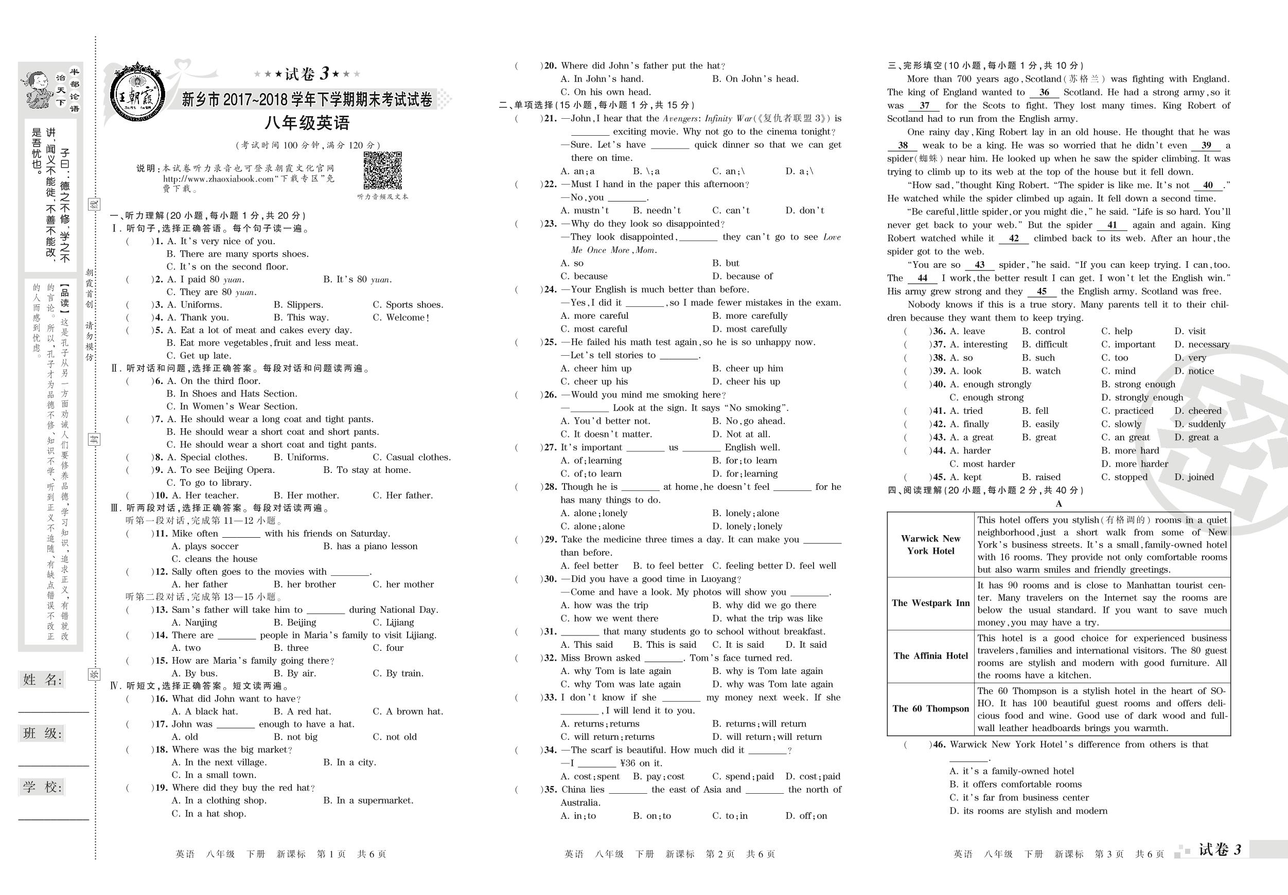 2017-2018学年第二学期新乡市八年级英语试卷(新课版)【3】